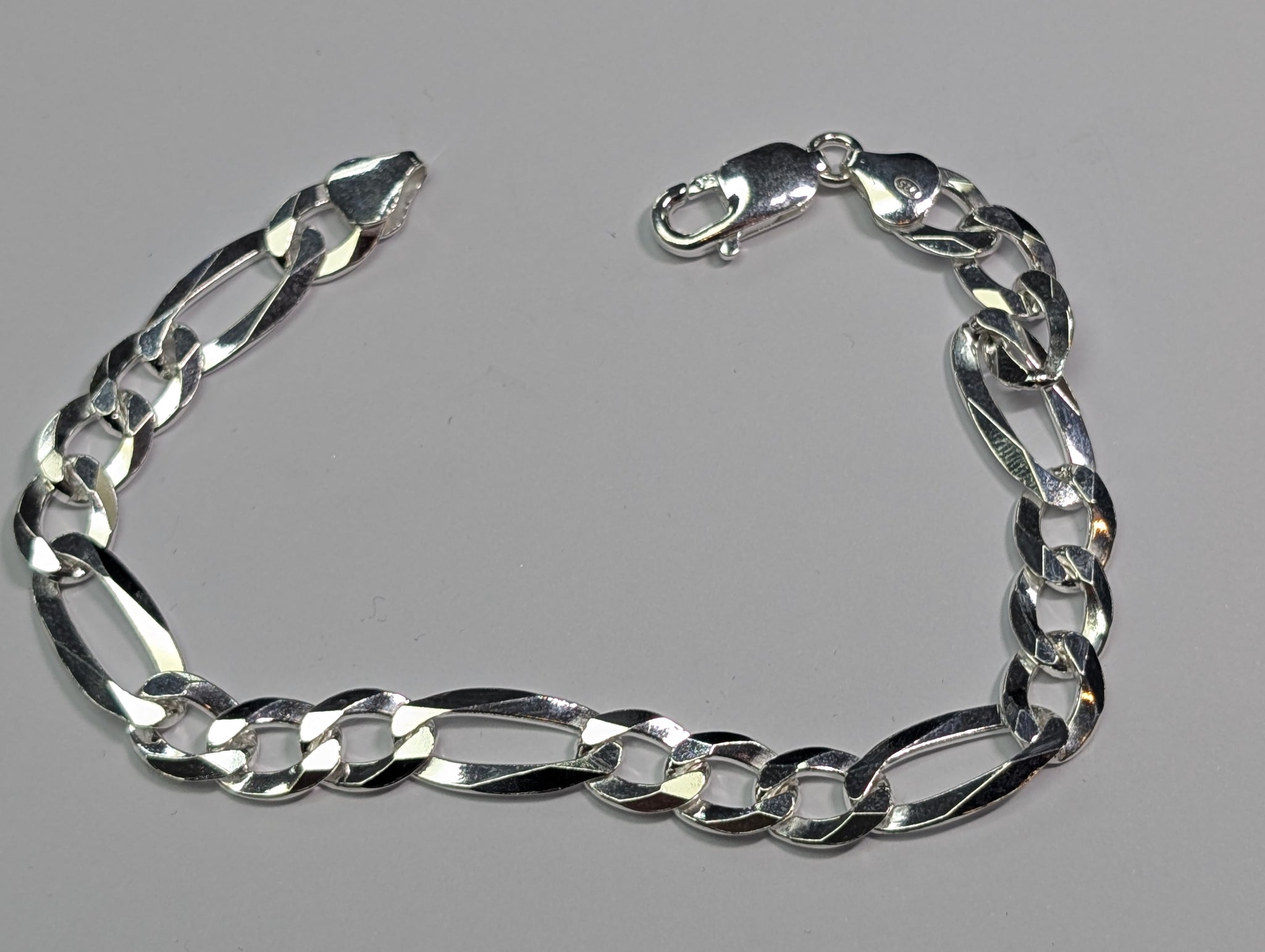HERE WE HAVE A BRAND NEW SILVER FIGARO BRACELET. **** THIS IS HALLMARKED 925 AND WEIGHS 15.06G. **** THE BRACELET IS 8.5" LONG. **** FOR ANY QUERIES PLEASE CALL OUR PRESTON STORE DIRECT MON-SAT 01772 204889