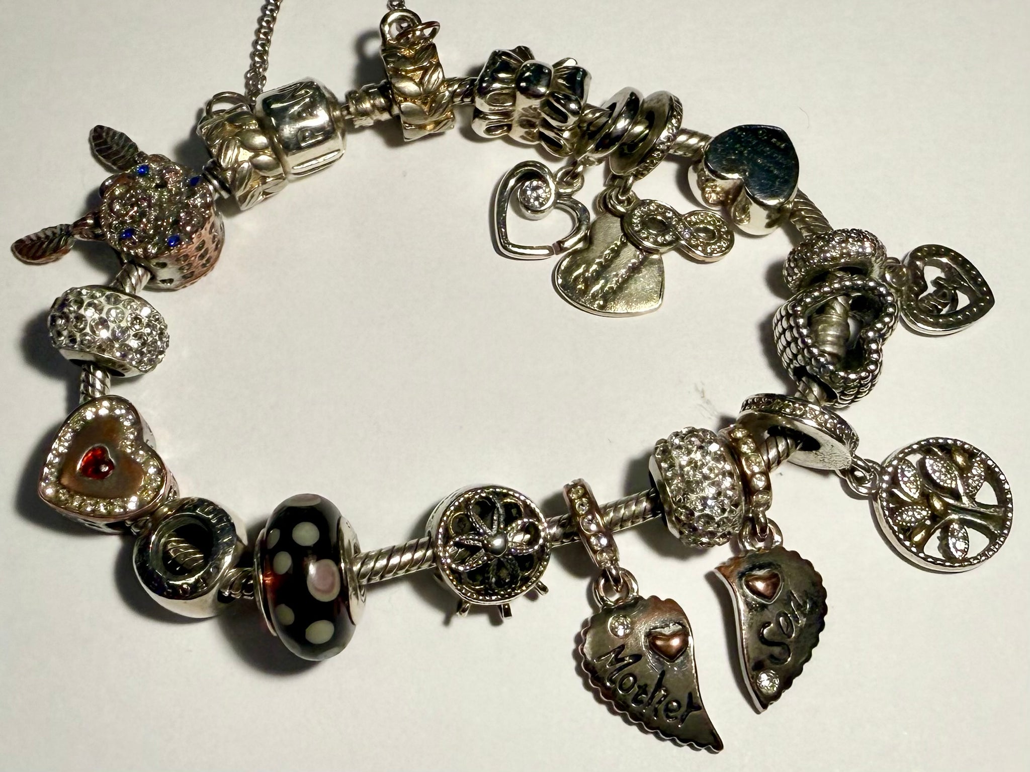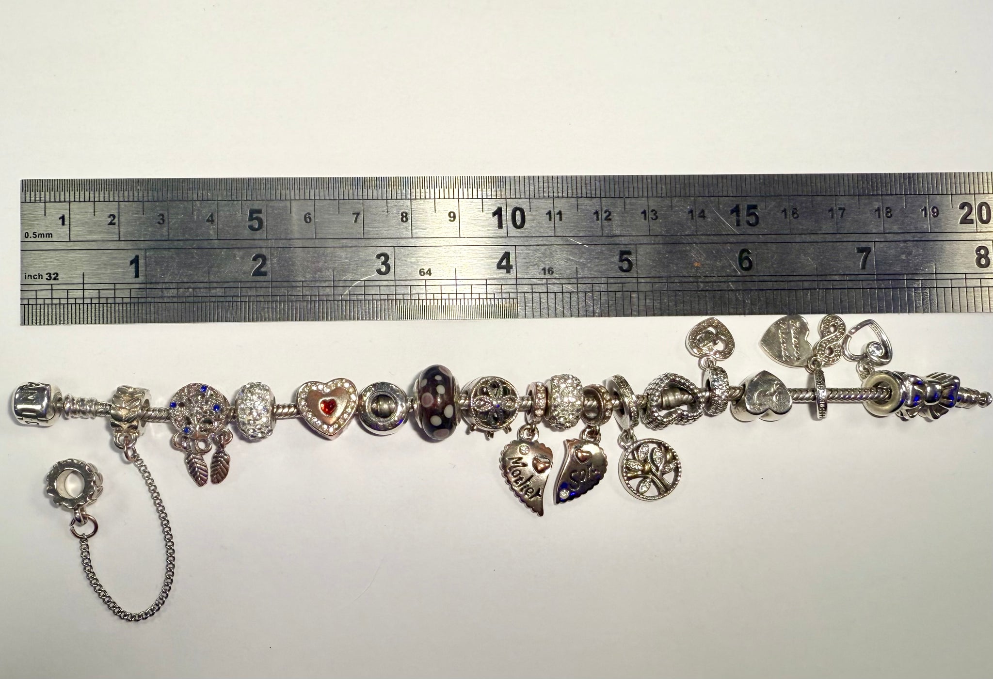 Pandora 8” Bracelet + 17 Charms with Safety Chain