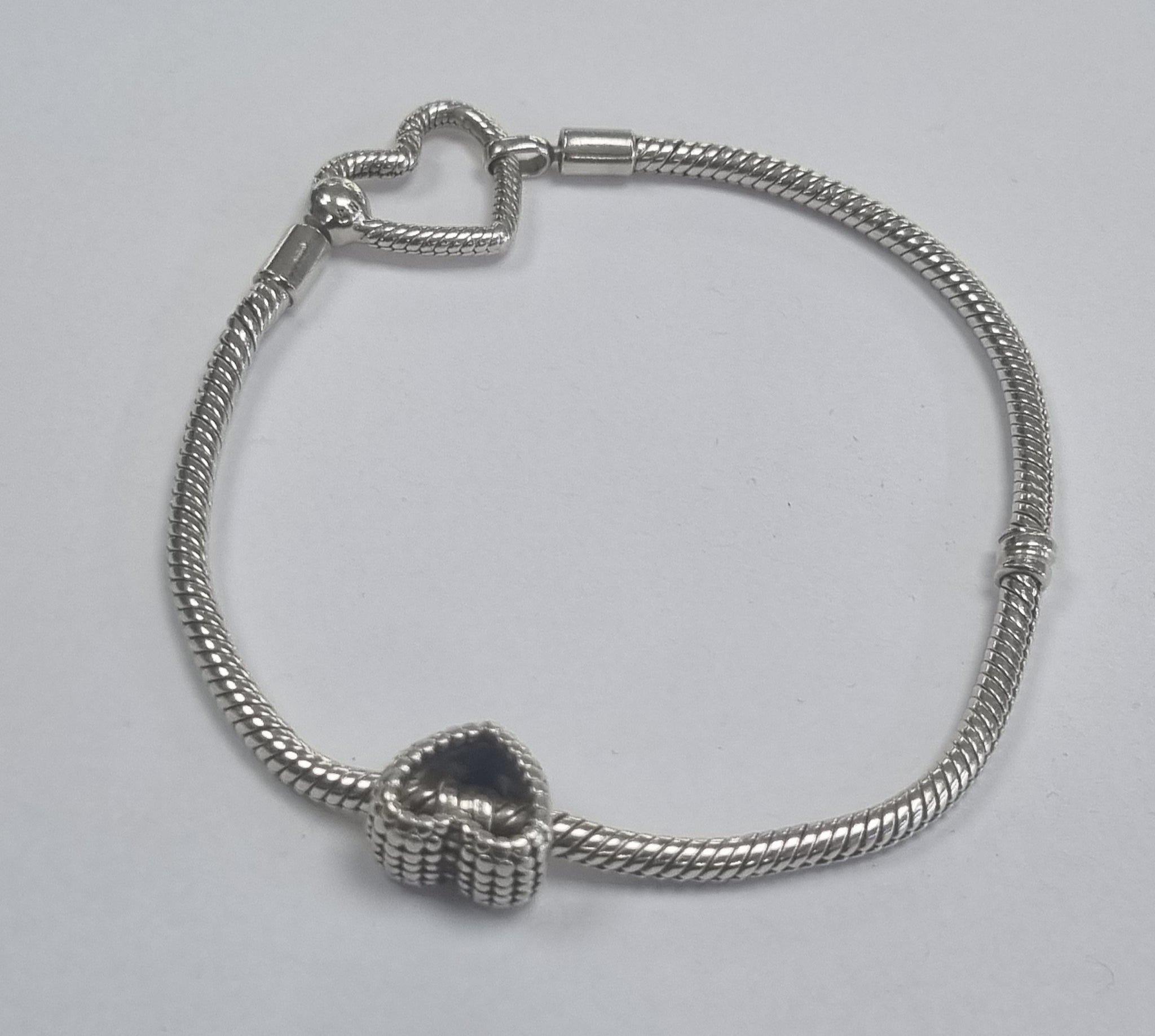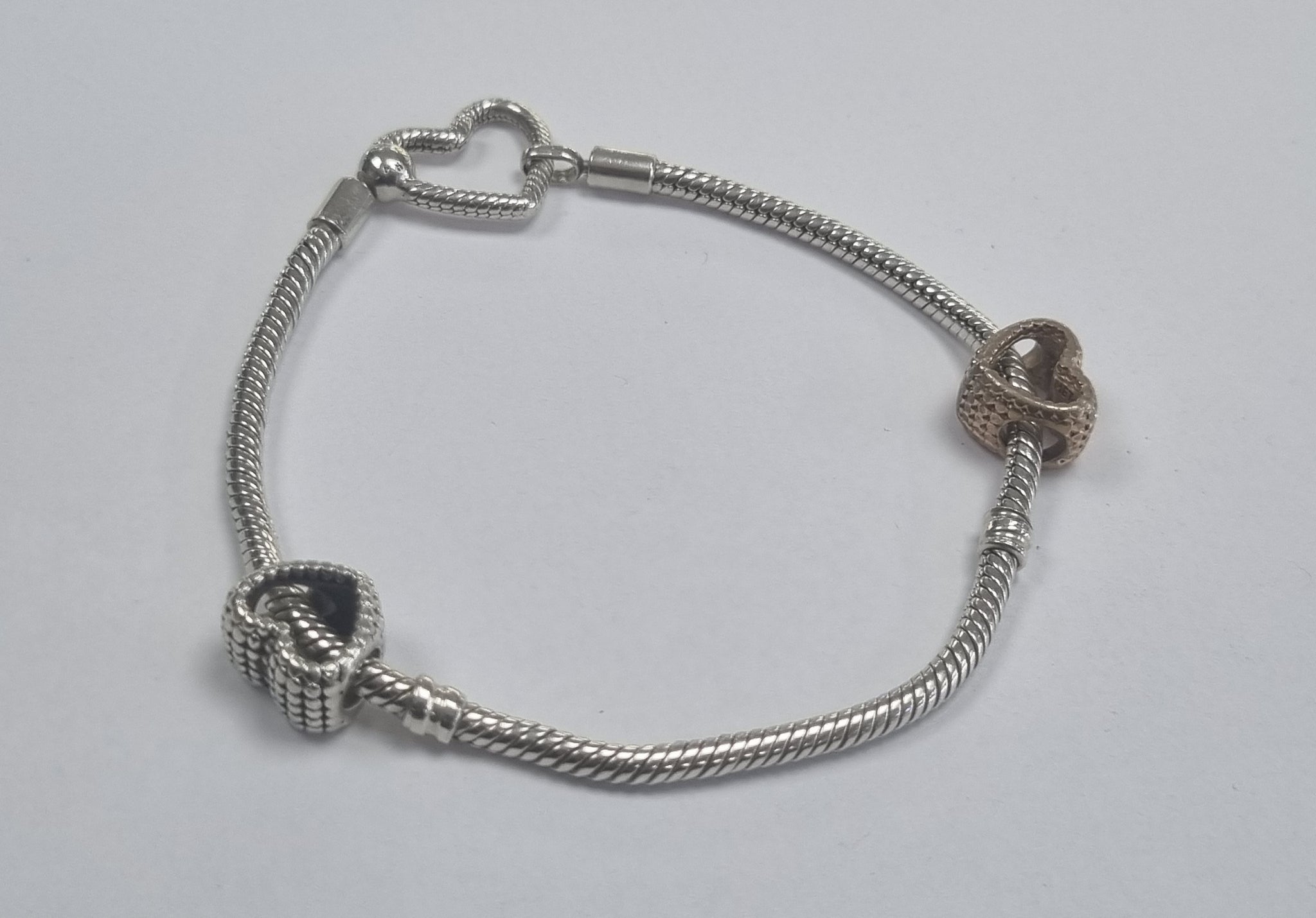 pandora heart closure bracelet with 2 charms, rose gold charm has light cosmetic marks, overall a nice peice, this is 18cm.