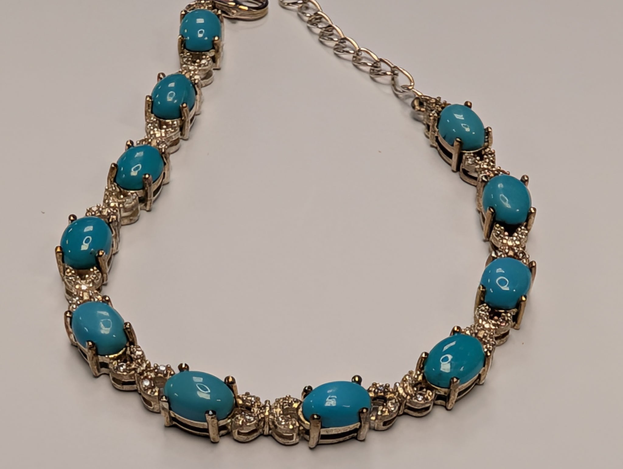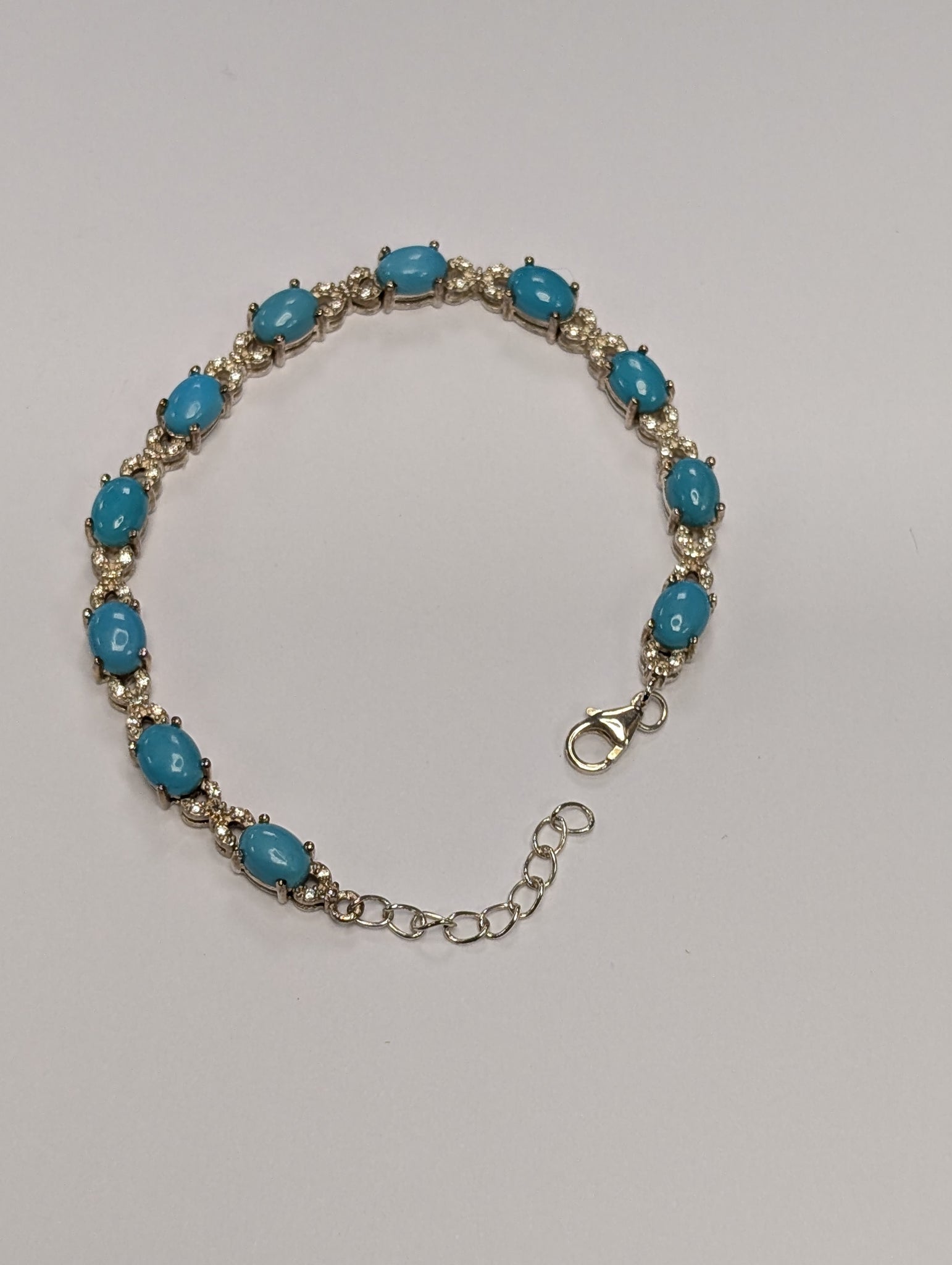 HERE WE HAVE A SILVER DIAMOND BRACELET WITH TURQUOISE COLOURED STONES. THIS WEIGHS 9.12G AND MEASURES 6" LONG NOT INCLUDING THE SAFTEY CHAIN. ** FOR ANY QUERIES PLEASE CALL OUR CHORLEY STORE DIRECT MON-SAT 01257 752333
