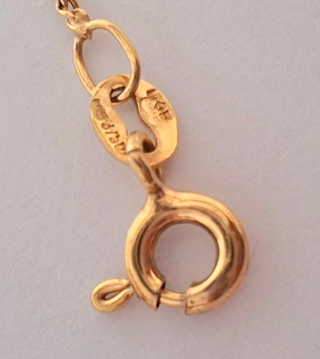 This Delicate 9 Carat Gold Chain with Full Hallmark comes with the pearlescent Pendant - Total weight together is 2.02 Grams - The chain length is 41cm when open. This item does come with a box