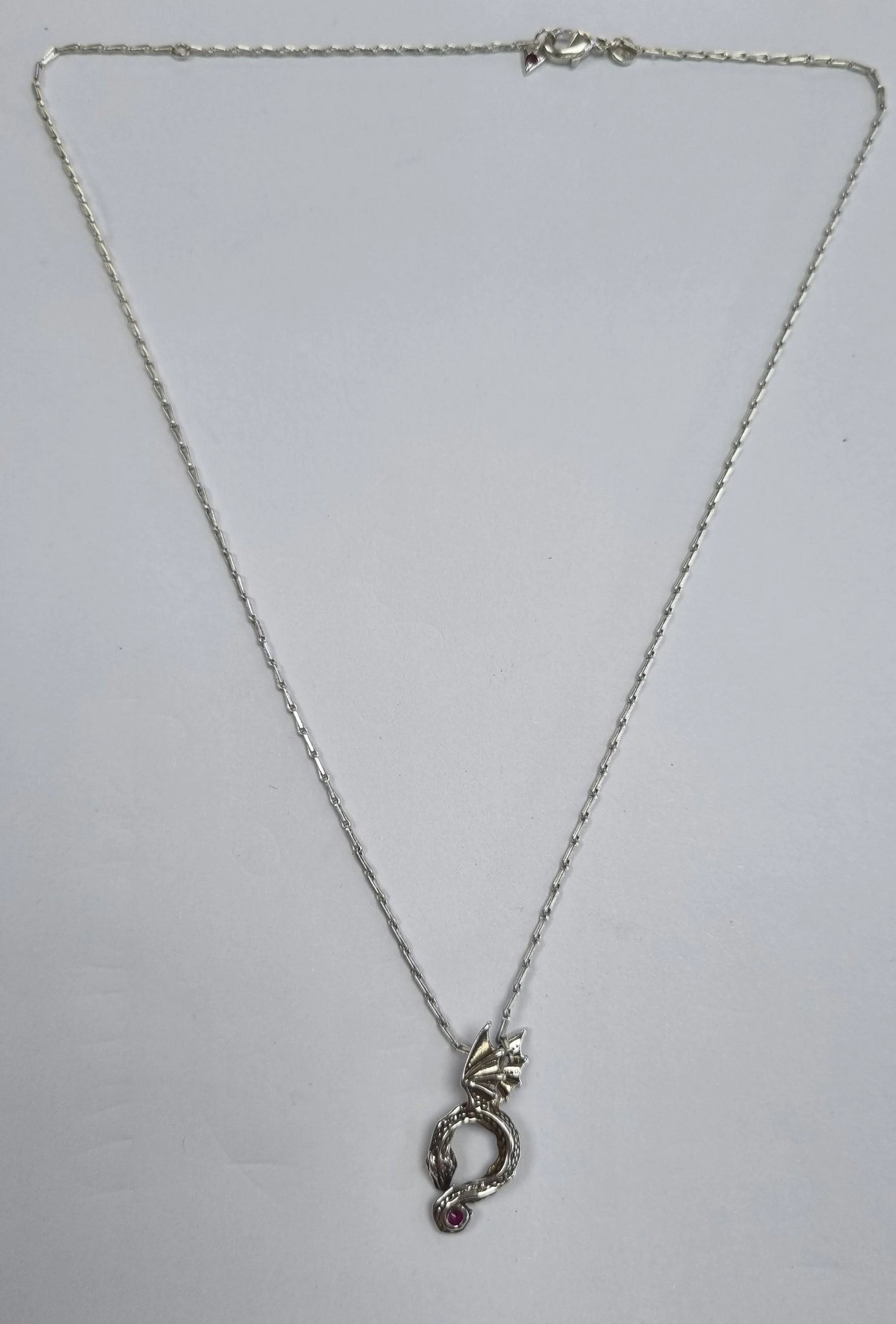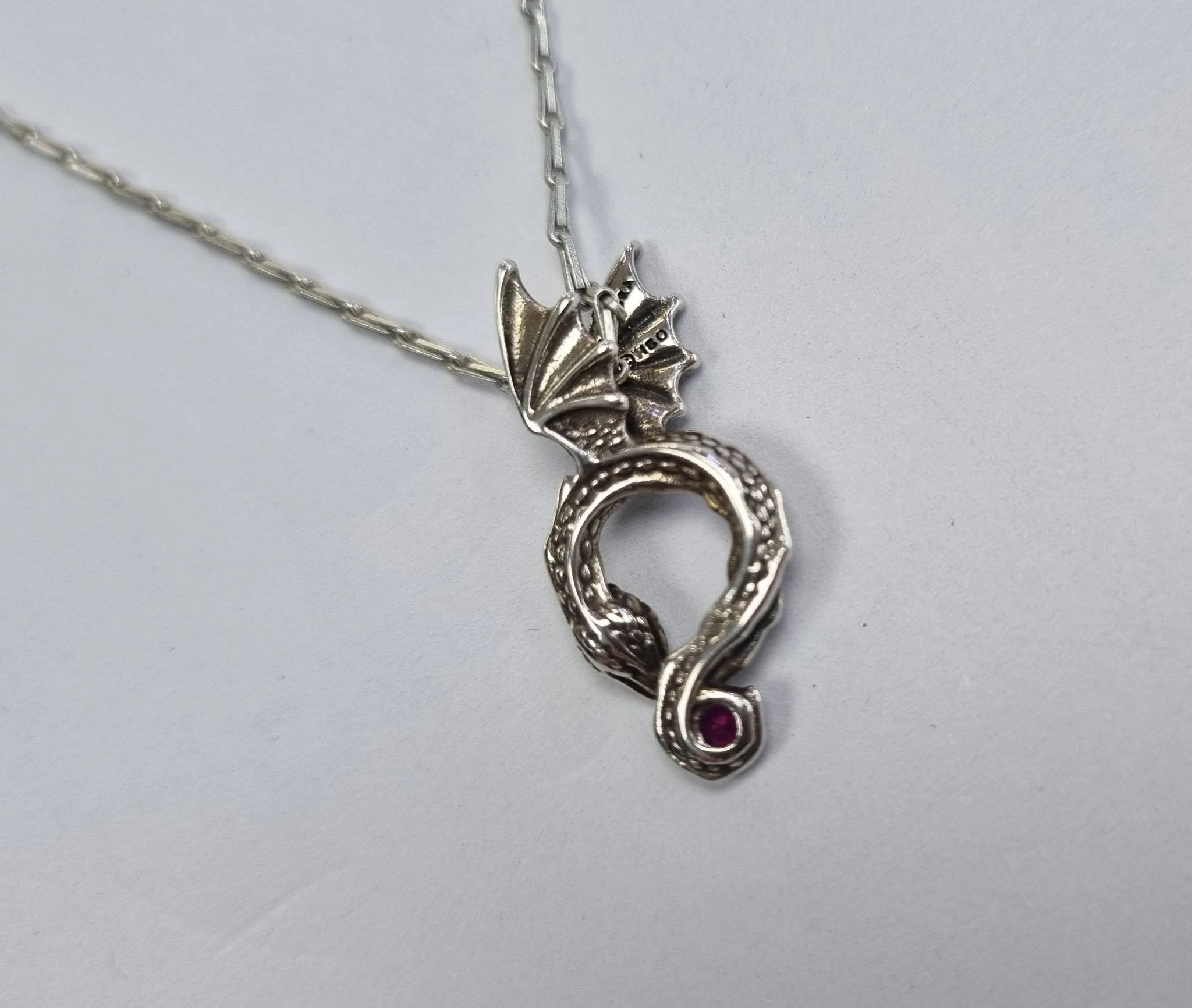 Comes in good condition unboxed, 925 sterling silver 16"Item Description - Make a statement with the Game of Thrones Dragon Pendant Necklace. Crafted in sterling silver, the pendant features salsa red man-made crystals and is suspended by a hidden jump ring between its wings, giving the illusion of flight. The chain, textured to resemble dragon scales, is 45 cm long and adjustable to 42 cm and 38 cm. Oxidisation enhances the details, adding a touch of darkness to this striking piece.