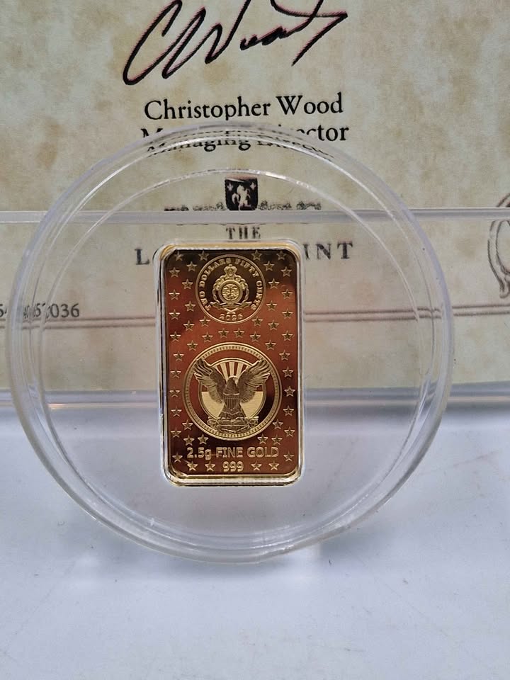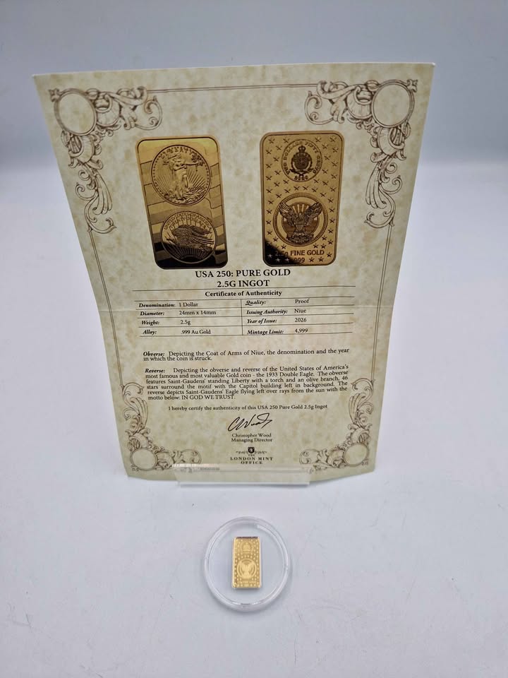 24CT Yellow Gold 2026 Proof USA 250: Pure Gold 1 Dollar Ingot - 2.5 Grams (With COA)
