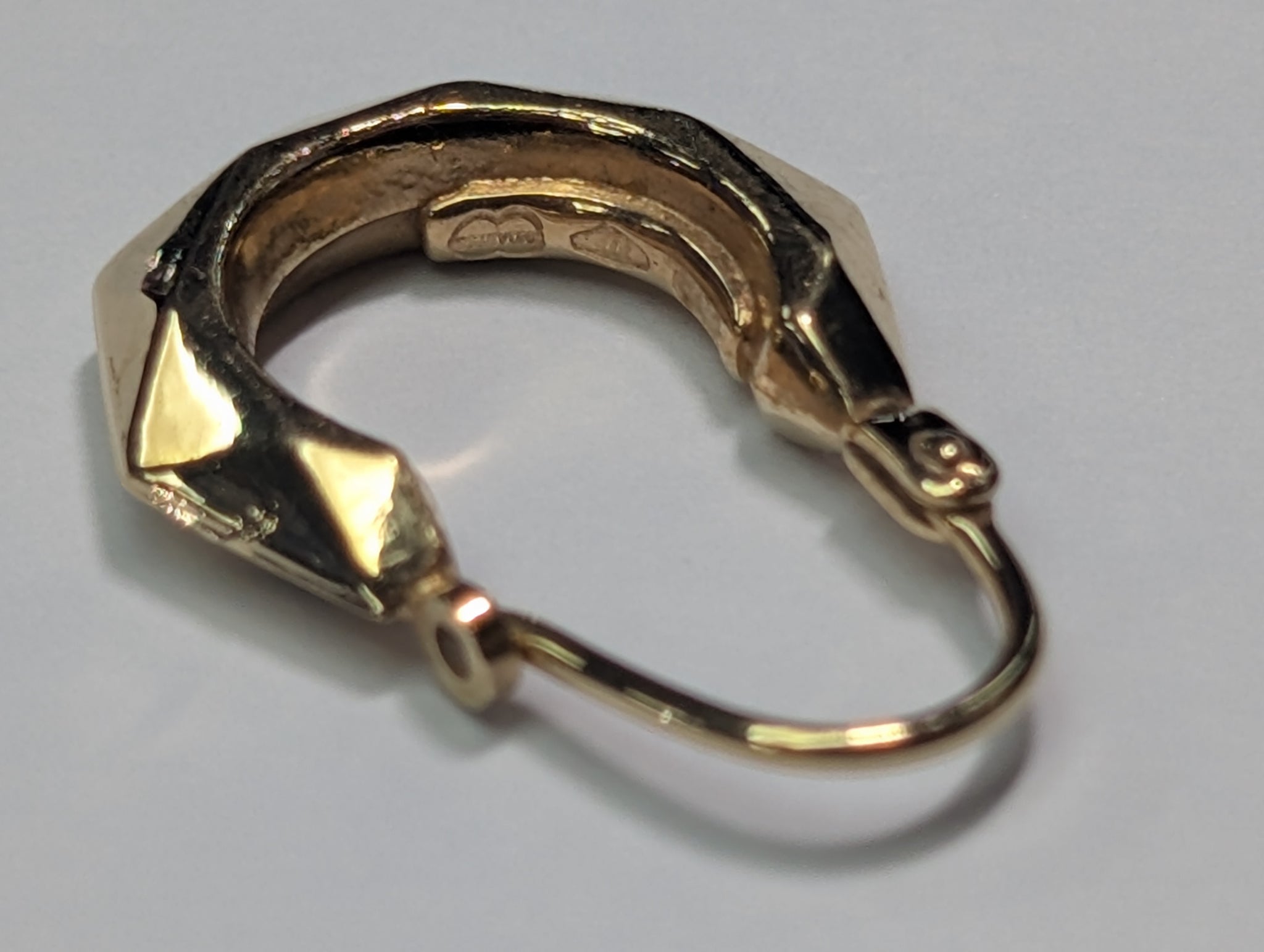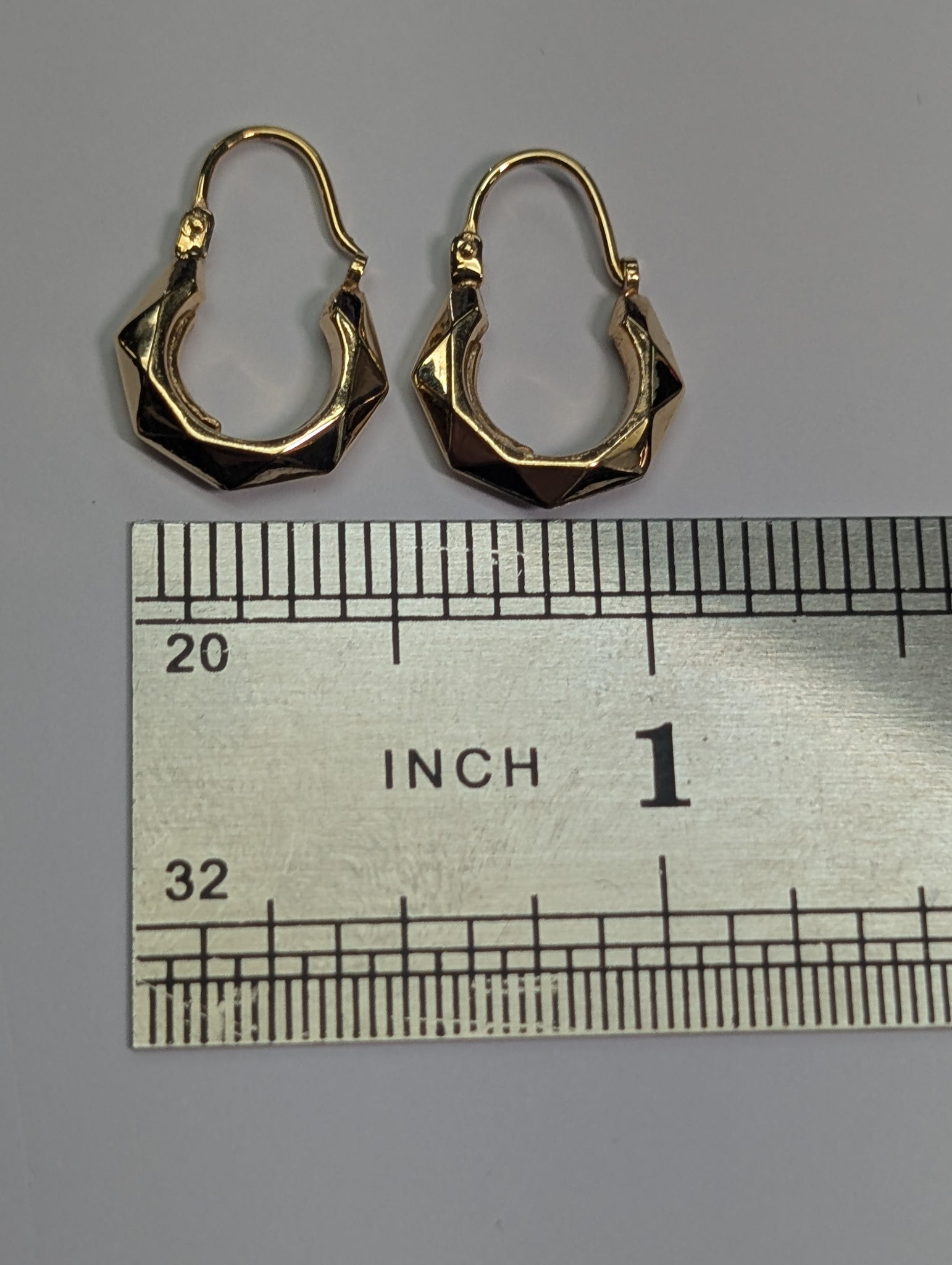 HERE WE HAVE A PAIR OF 9CT GOLD ANGULAR HOOP EARRINGS. THESE EARRINGS WEIGH 1.08G AND IN GOOD CONDITION ****** FOR ANY QUERIES PLEASE CALL OUR PRESTON STORE DIRECT MON-SAT 01772 204889