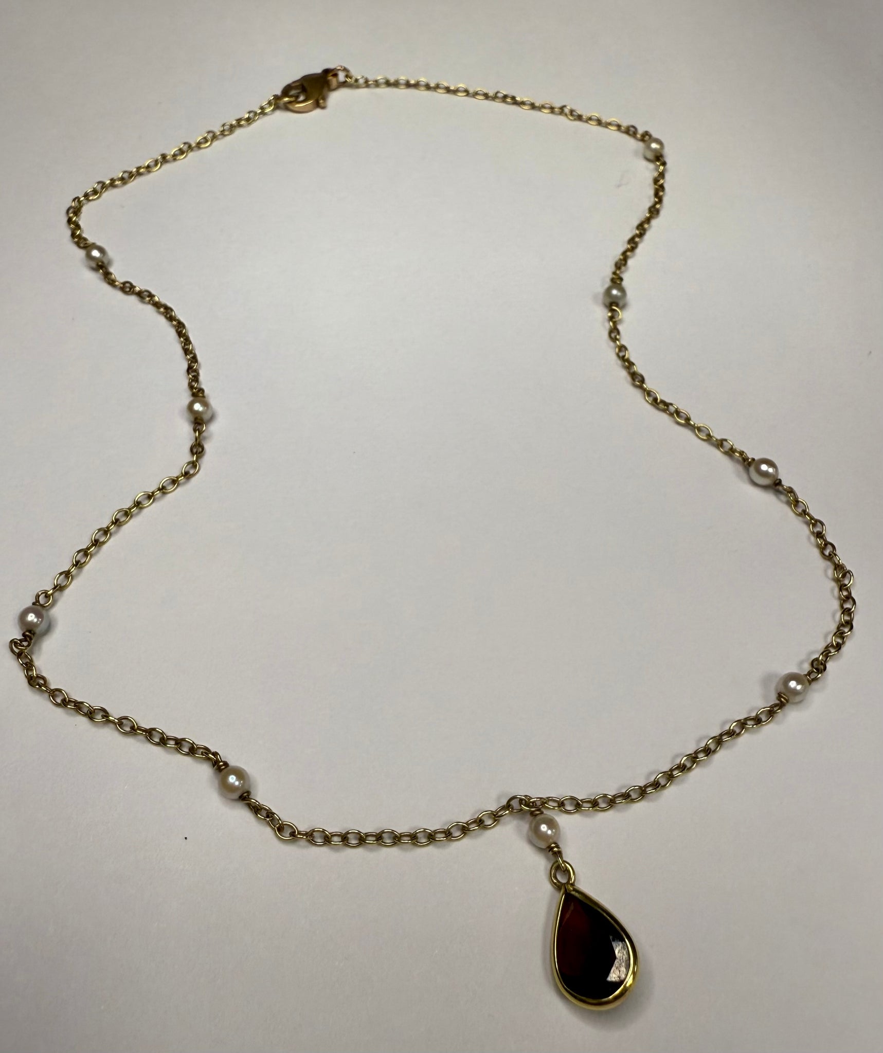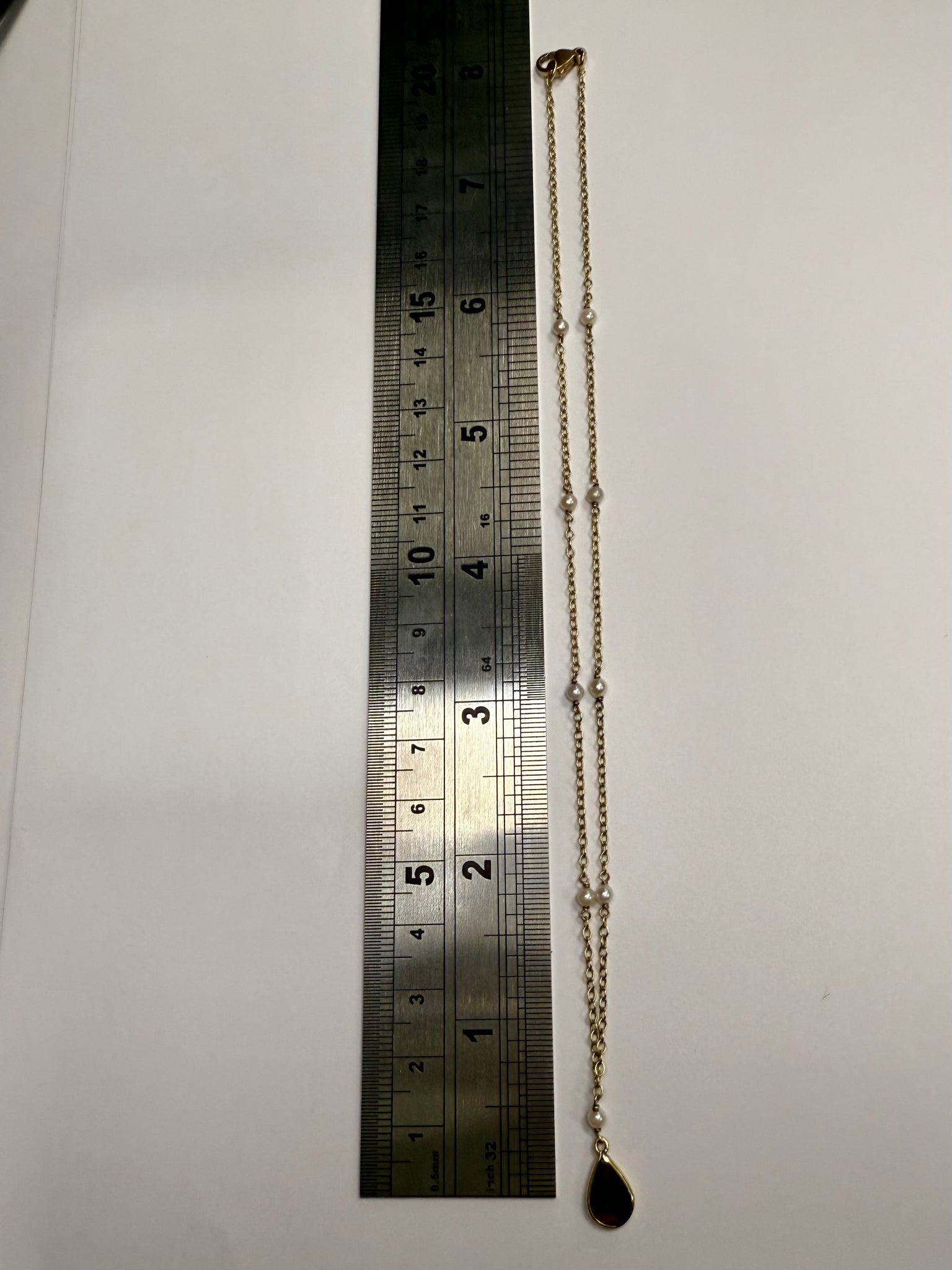 Here we have a 9ct gold necklace with pearl like beads fixed to the length of the chain. This is 16 inches long, weighs 2.74 grams and features a red stone pendant. ** For any queries please contact our Chorley store direct on 01752 752333