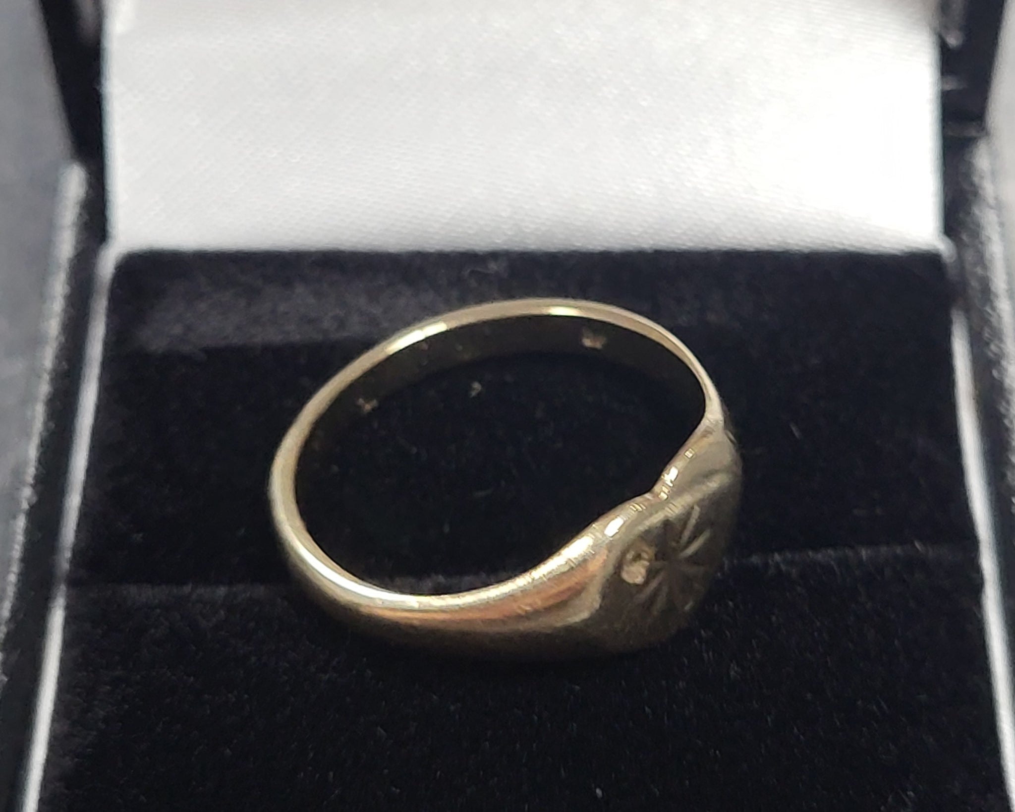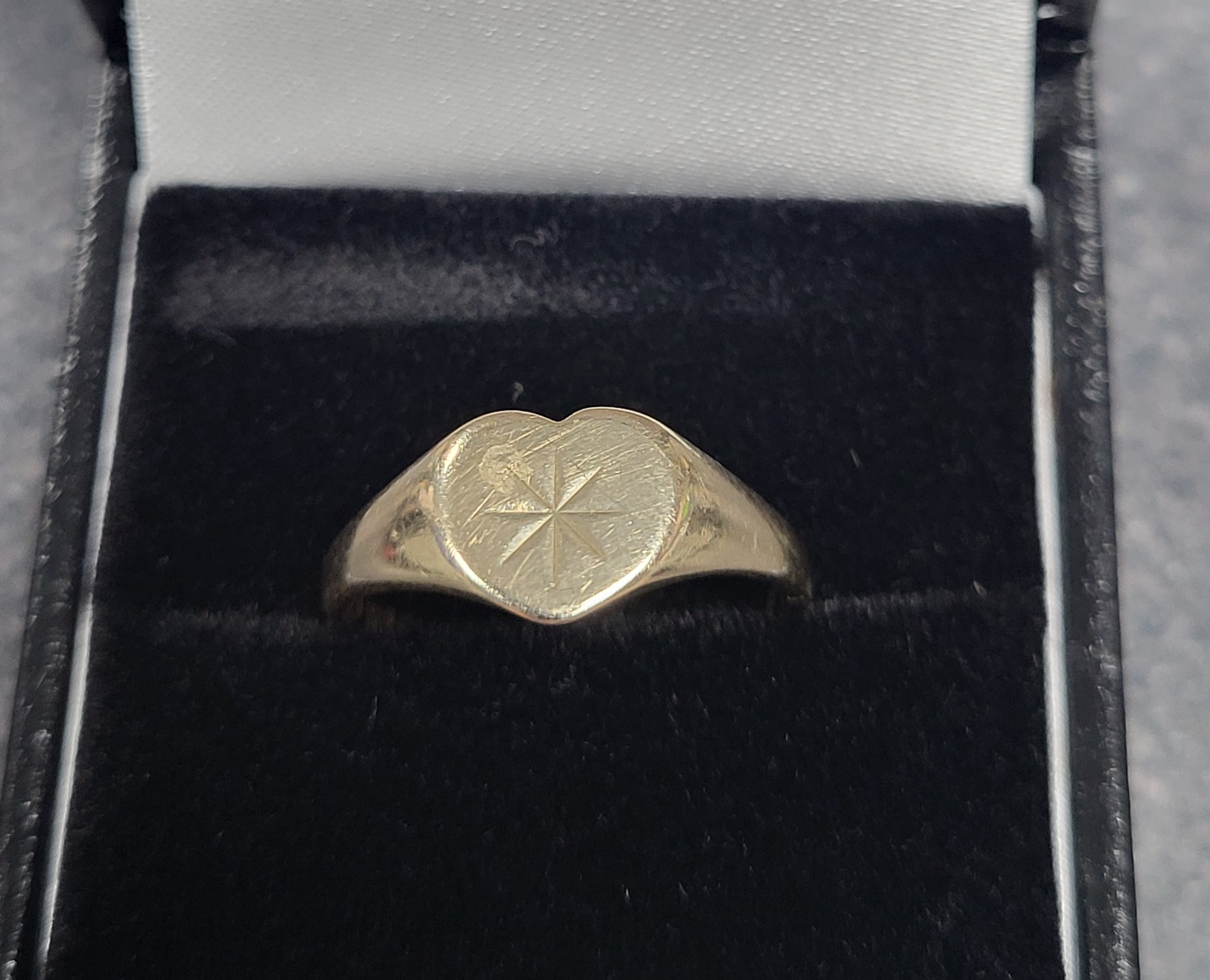375 - Yellow Gold Heart Signet Ring - 2.46g - Size O - Hallmarked
