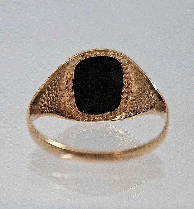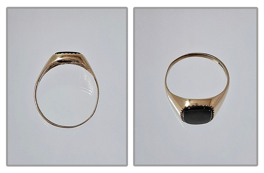 9 Carat Gold - Yellow Gold - Rectangle Signet Ring - Black Center - Total weight including the centerpiece is 3.46 Grams - Full 9 Carat Hallmark - Size X - Unboxed