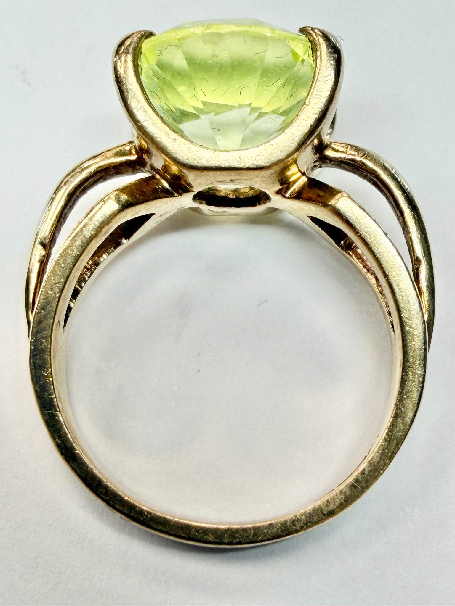 A beautiful unique 9ct gold ring with a large lime green stone, this weighs 5.9 grams and is a size M