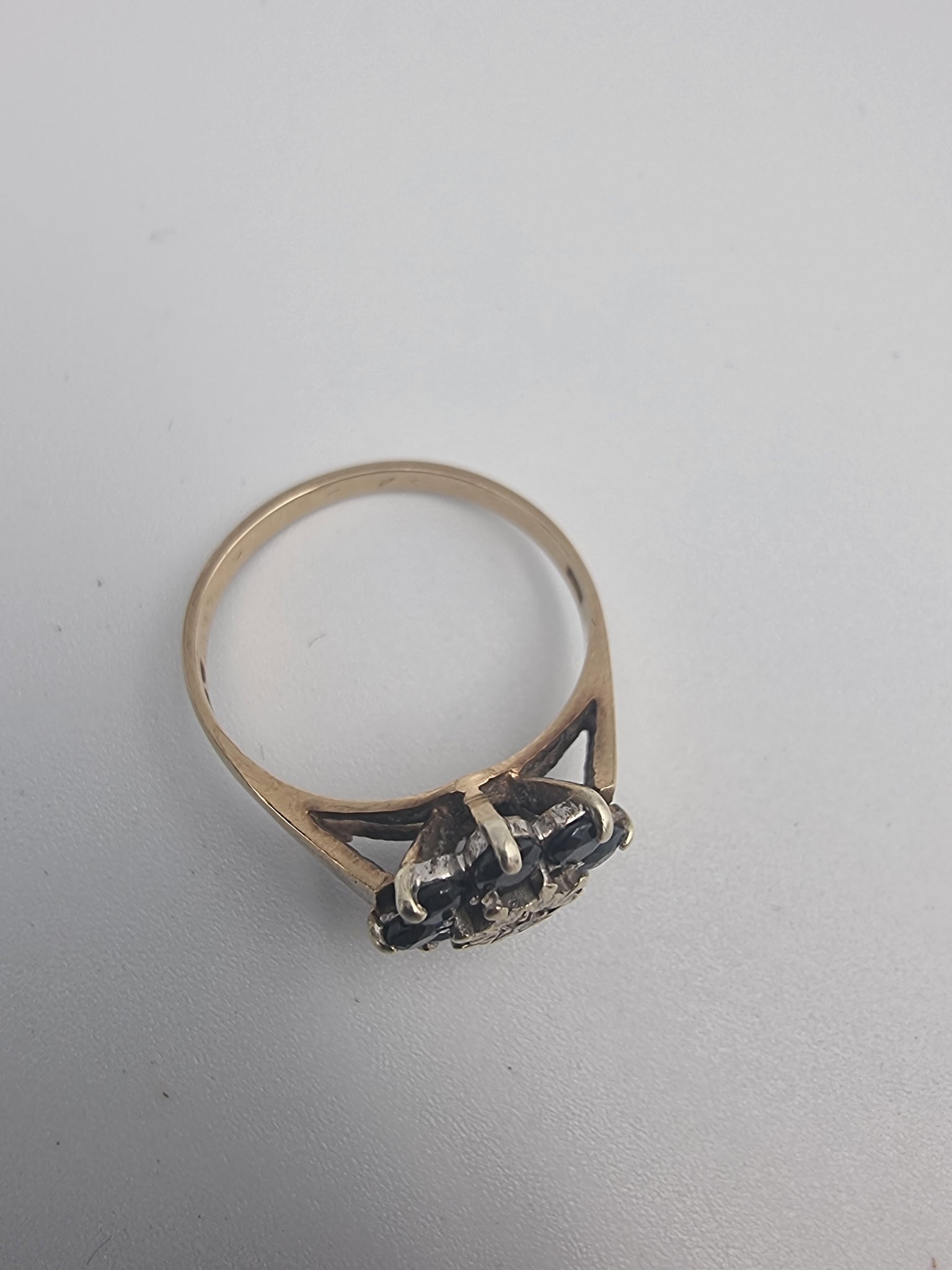 9CT Yellow gold fully hallmarked women's ring 2.85g size P with 8 black stones and cz center stone set