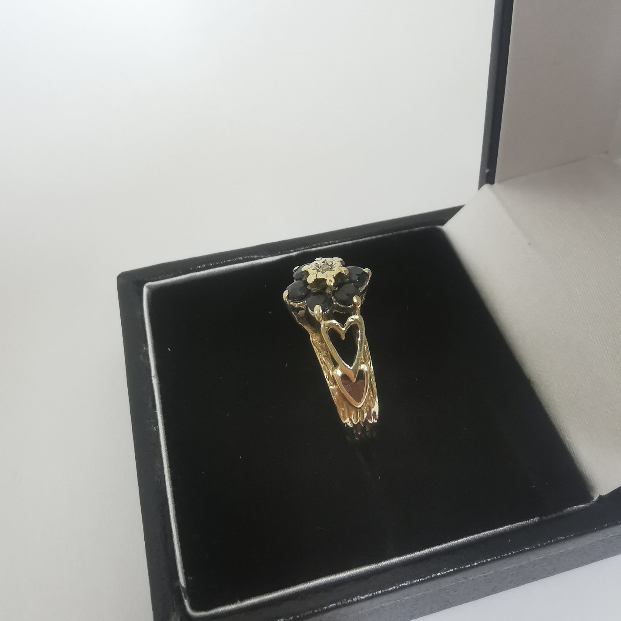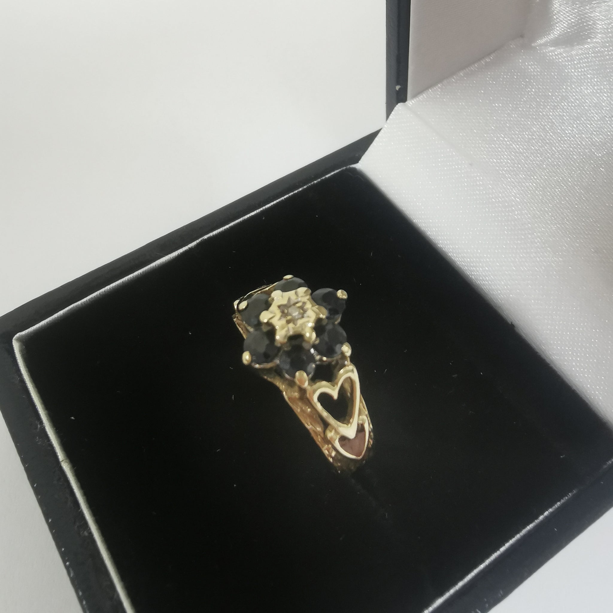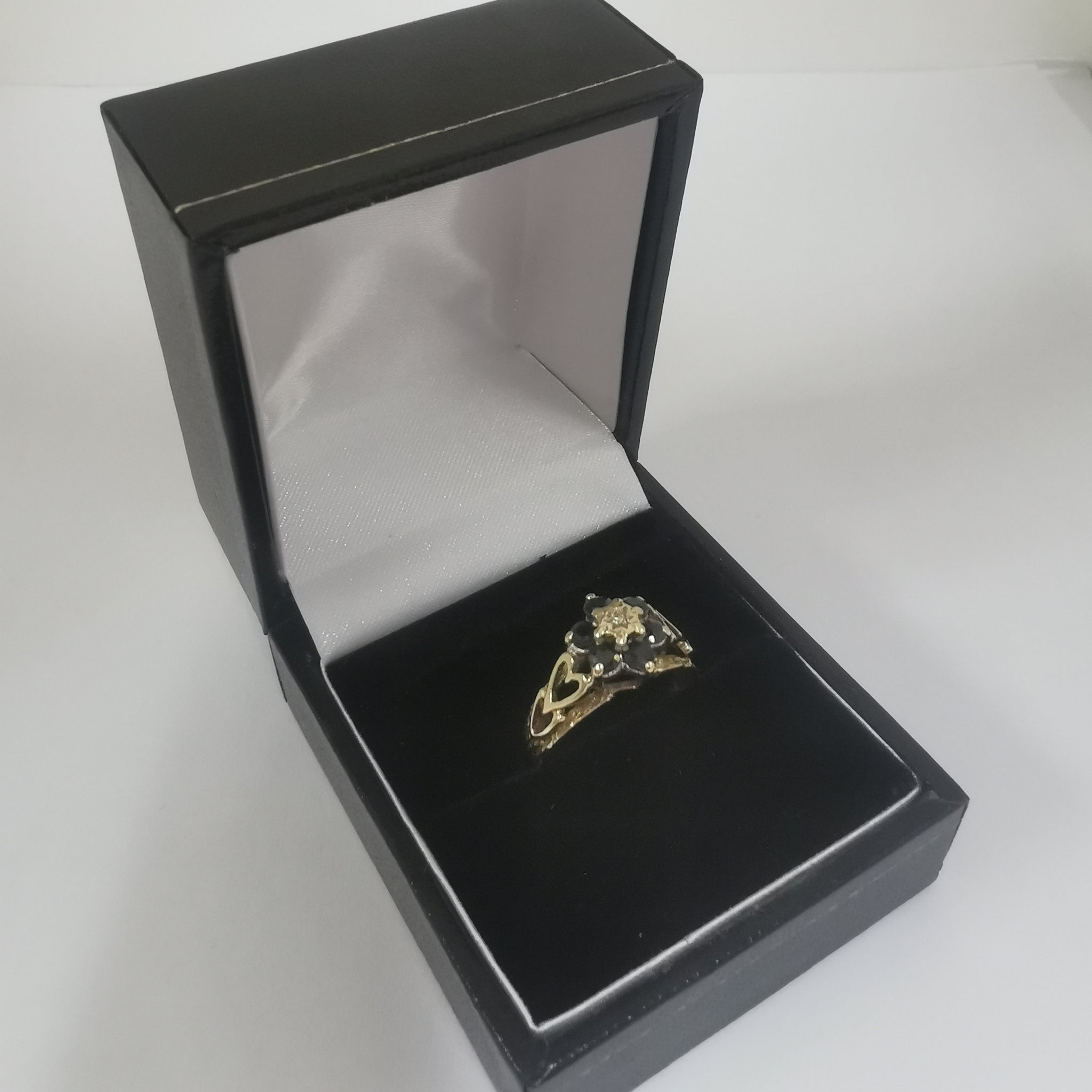 9K Gold Moissanite Black Flower Stone Ring, Love Heart Side Design, 375 Hallmarked, Size: J, 2.2Grams
