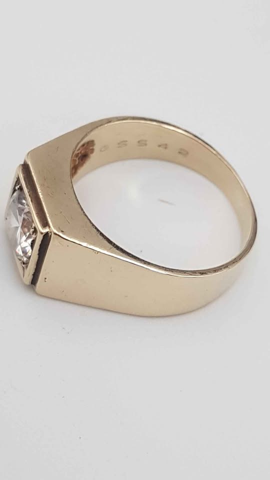 Mens 9ct Ring 6.5g with clear centre stone with presentation box Size S Item is in wearable condition, however as a pre owned item it may have signs of use such as light marks, please see photos Harpurhey store