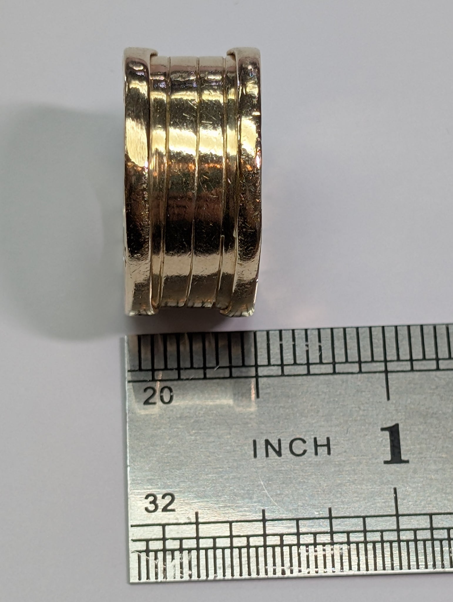 HERE WE HAVE A 14CT GOLD PUZZLE RING. THIS WEIGHS 19.73G AND A SIZE T. THIS IS HANDMADE AND HAS VARIOUS LETTERING ON THE SIDE AS SHOWN. THIS IS NOT BEING SOLD AS ANY TYPE OF FASHION BRANDED RING. ** FOR ANY QUERIES PLEASE CALL OUR PRESTON STORE DIRECT MON-SAT 01722 204889