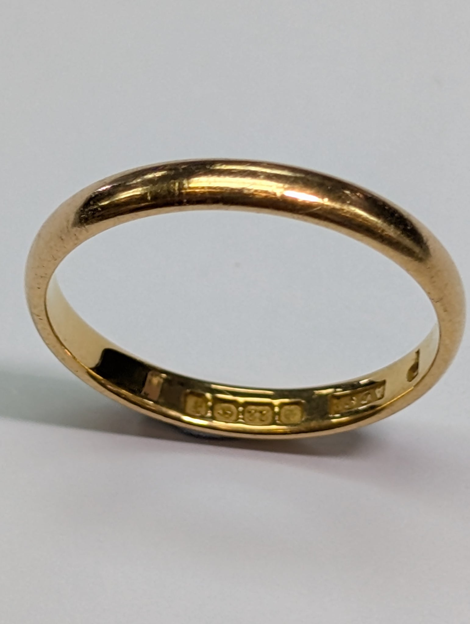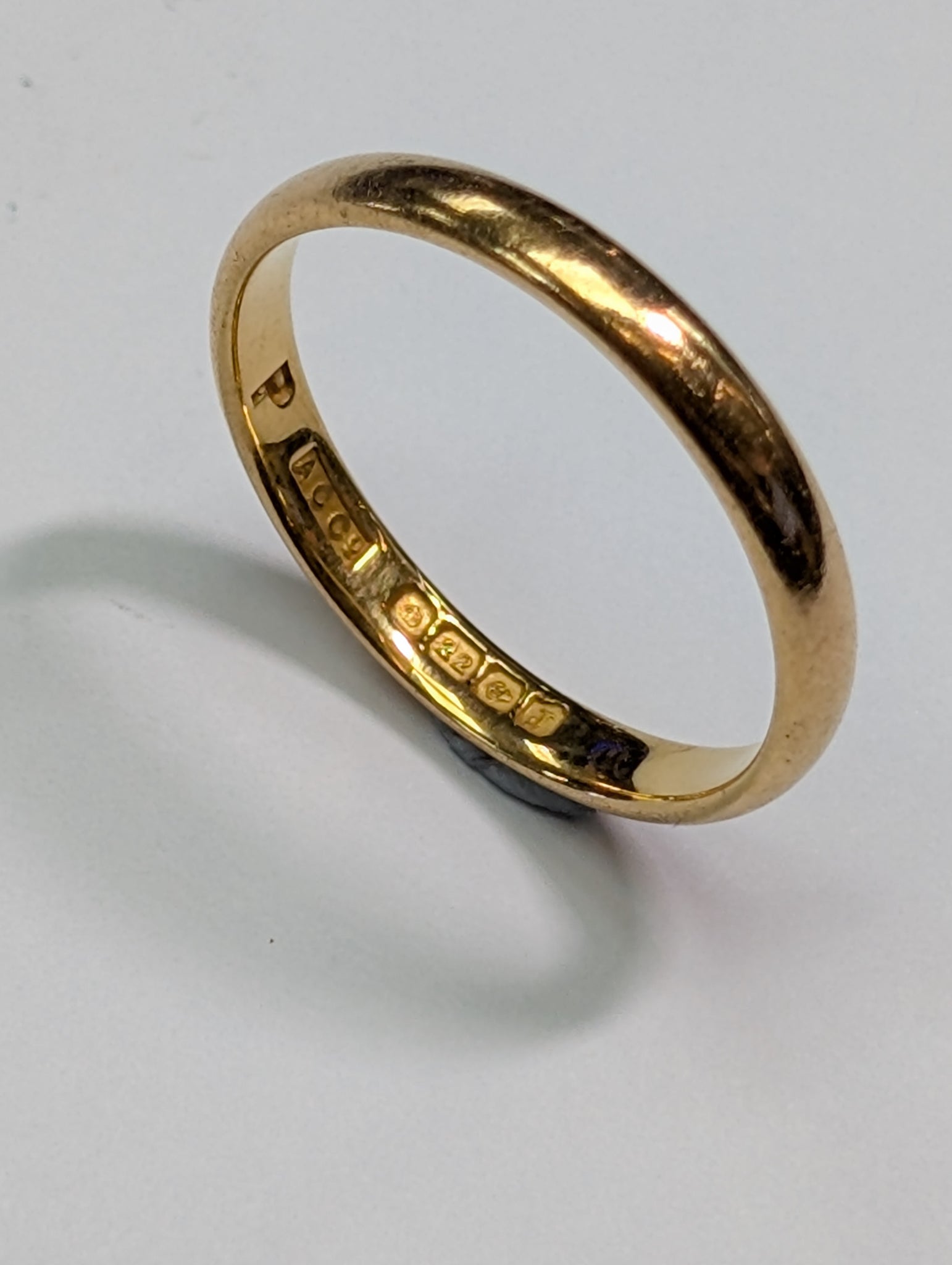 HERE WE HAVE A 22CT GOLD WEDDING BAND RING. THIS WEIGHS 3.02G AND A SIZE P ****** FOR ANY QUERIES PLEASE CALL OUR PRESTON STORE DIRECT MON-SAT 01772 204889