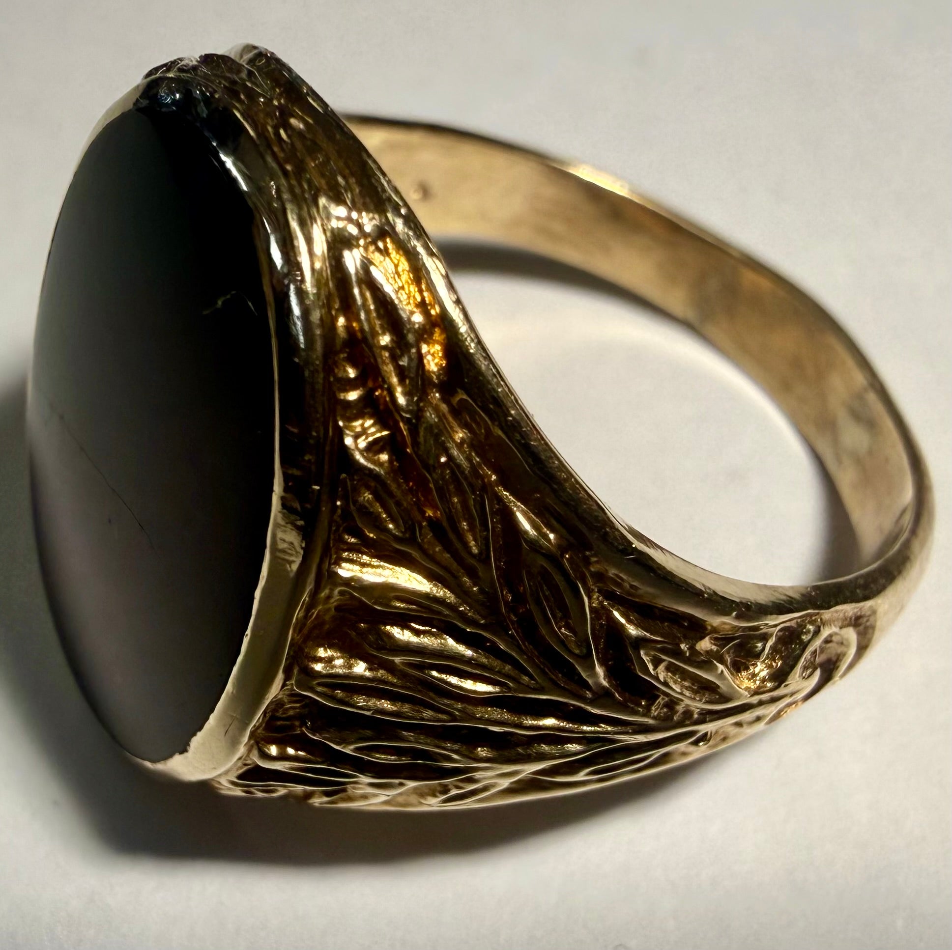 Here we have a 9ct gold patterned signet ring with a black centre stone. ***This is in good condition, a size W and weighs 8.5 grams. ***For any queries please call our Chorley store direct from Mon-Sat on 01257 752333.