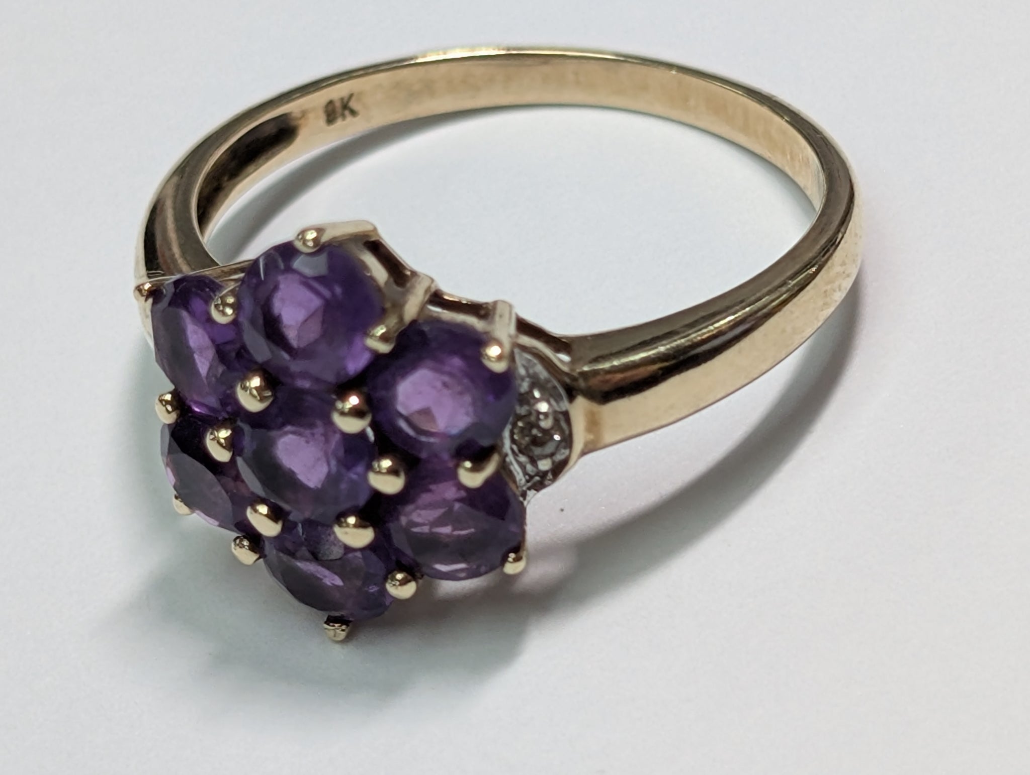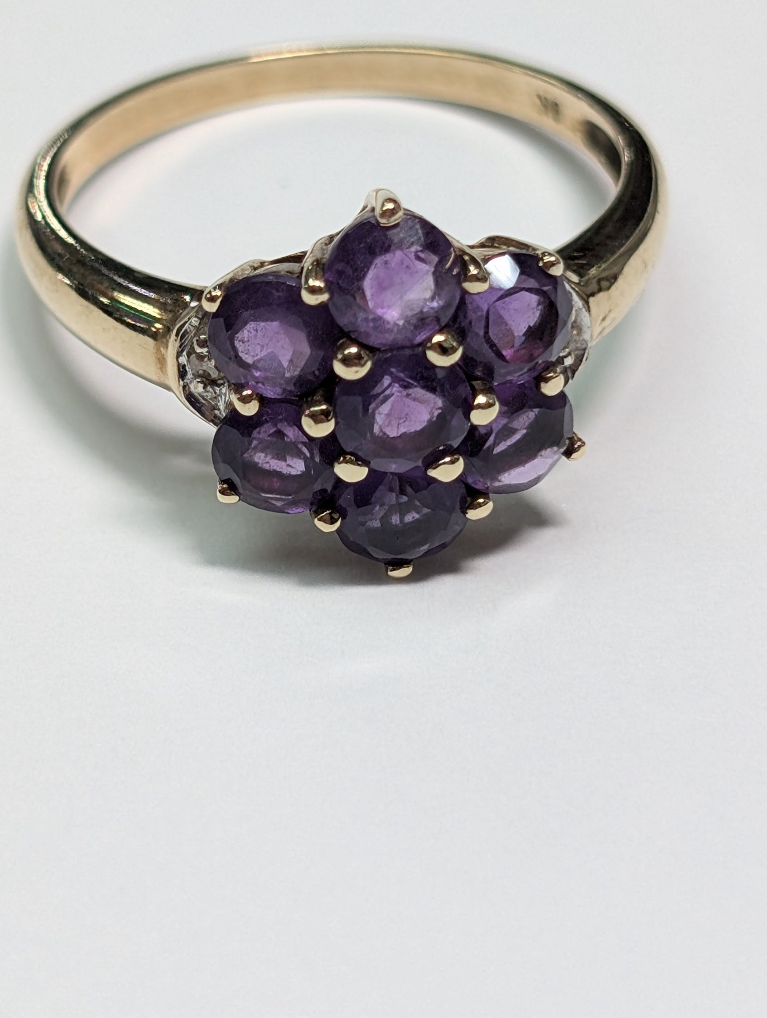HERE WE HAVE A 9CT GOLD RING WITH PURPLE STONES; A DIAMOND ON EITHER SIDE.**** THIS WEIGHS 2.67G AND IS A SIZE P 1/2.**** FOR ANY QUERIES PLEASE CONTACT OUR PRESTON STORE DIRECTLY MON-SAT AT 01772 204889.