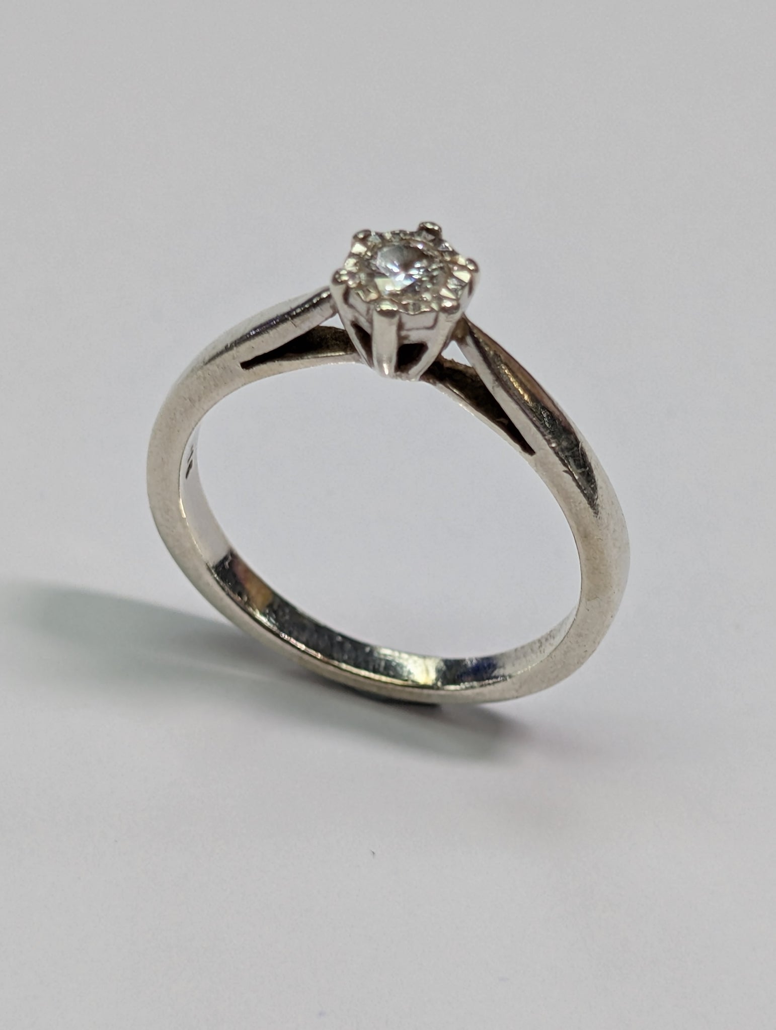 HERE WE HAVE A 9CT WHITE GOLD DIAMOND RING. THIS WEIGHS 3.22G AND A SIZE O 1/2. THE SINGLE DIAMOND IS .15PTS ** FOR ANY QUERIES PLEASE CALL OUR PRESTON STORE DIRECT MON-SAT 01772 204889