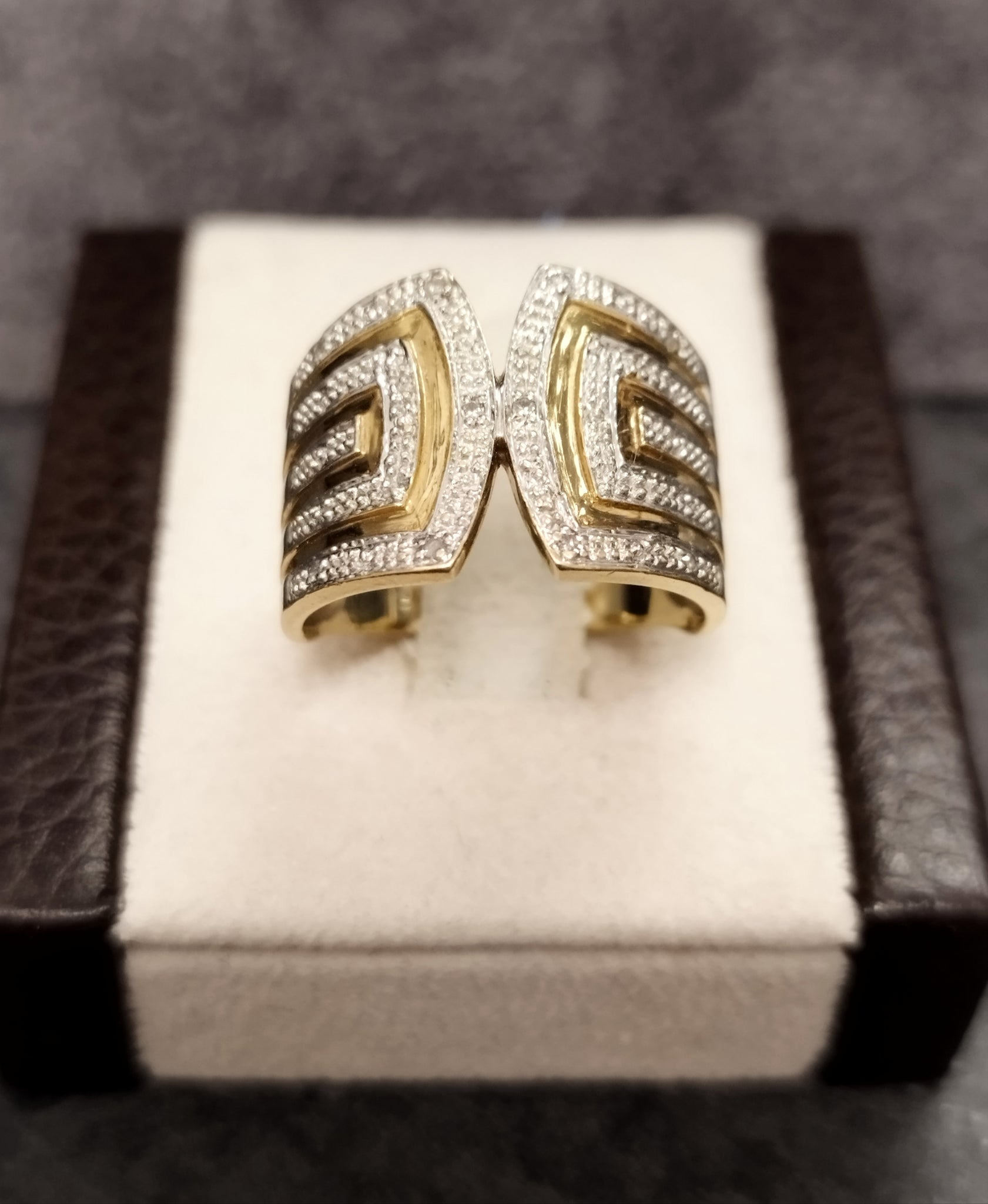 9ct gold open ring featuring a pave Greek design set with 10 small diamonds. A great addition to any jewellery collection. This stylish ring is suitable for everyday wear as a great addition to any outfit.