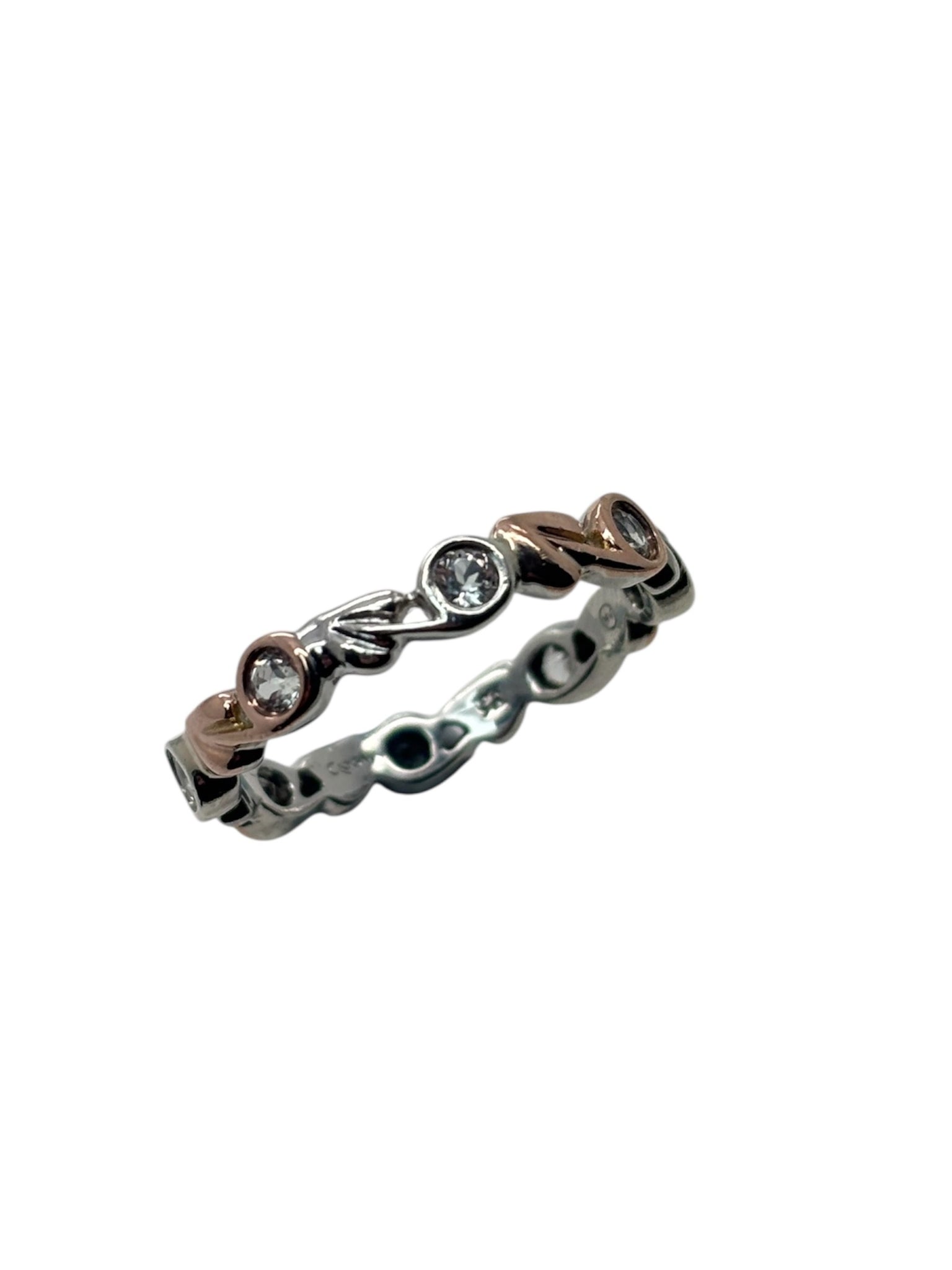 In great condition. Ring has been polished and is hallmarked. 9ct Rose Gold and 925 Silver going around the band with 8 individual CZ stones. Comes with box. Size Q.