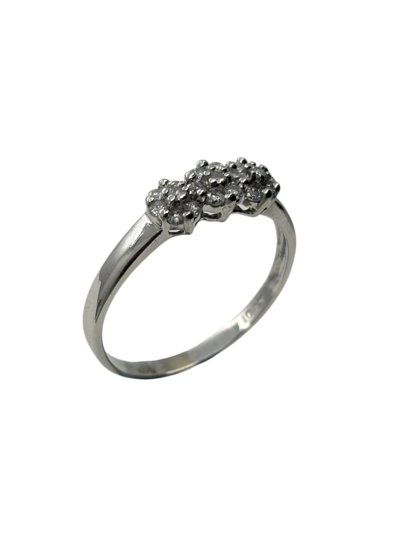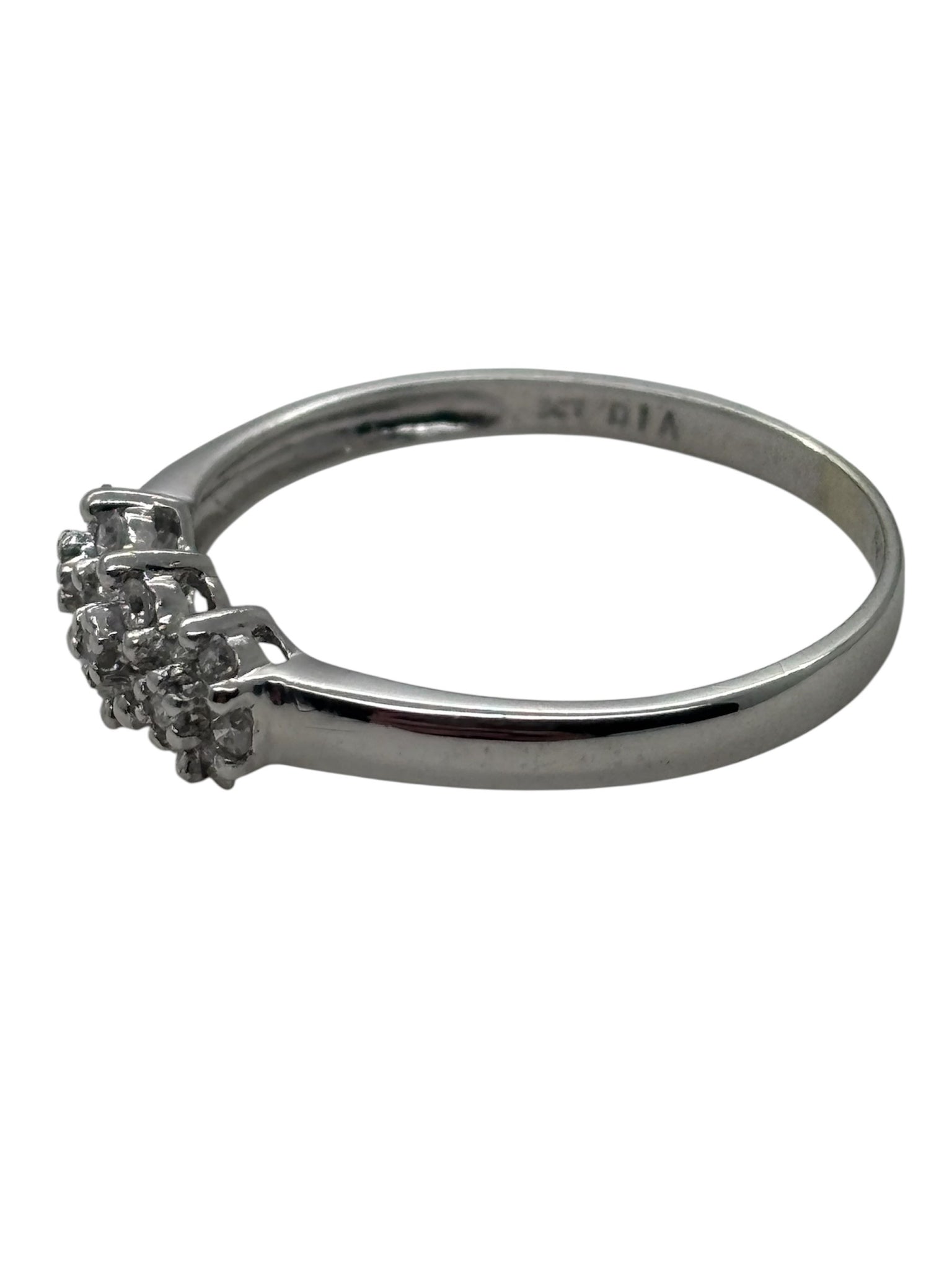 In great condition. Ring has been polished and is hallmarked. 9ct White Gold with 19 individual Diamonds in the shape of 3 flowers. Size S. Comes with box.