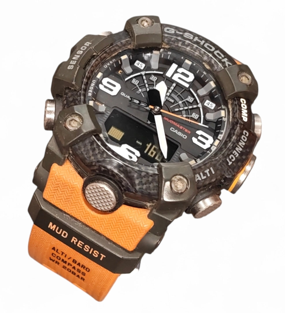 The G-Shock Mudmaster is a line of rugged watches from Casio's premium Master of G series, specifically engineered to withstand extreme environments scattered with mud, dirt, and debris. They are renowned for their exceptional durability and range of outdoor-focused features. Mud-Resistant Structure: A patented gasket system and highly airtight case, often using a carbon core guard structure, prevent the intrusion of mud, dust, and debris. Sensors: Most models feature a Triple Sensor or Quad Sensor system, including a compass, altimeter/barometer, and thermometer. Some also have a built-in accelerometer for a step counter. Durability: These watches are designed to be shock-resistant, with 200-meter water resistance. Higher-end models like the GWG-B1000 feature scratch-resistant sapphire crystal glass. Power Source: Many Mudmaster watches are Tough Solar powered, using high-capacity solar cells on the watch face to charge the battery from any light source, ensuring long-term reliability without frequent battery changes. Connectivity: The newer GG-B100 and GWG-B1000 series include Bluetooth connectivity to link with the CASIO WATCHES app for features like automatic time adjustment, mission logs, and location indicators. Design: They are known for their large, robust, and tactical appearance, with large buttons that are easy to operate, even with gloves on.