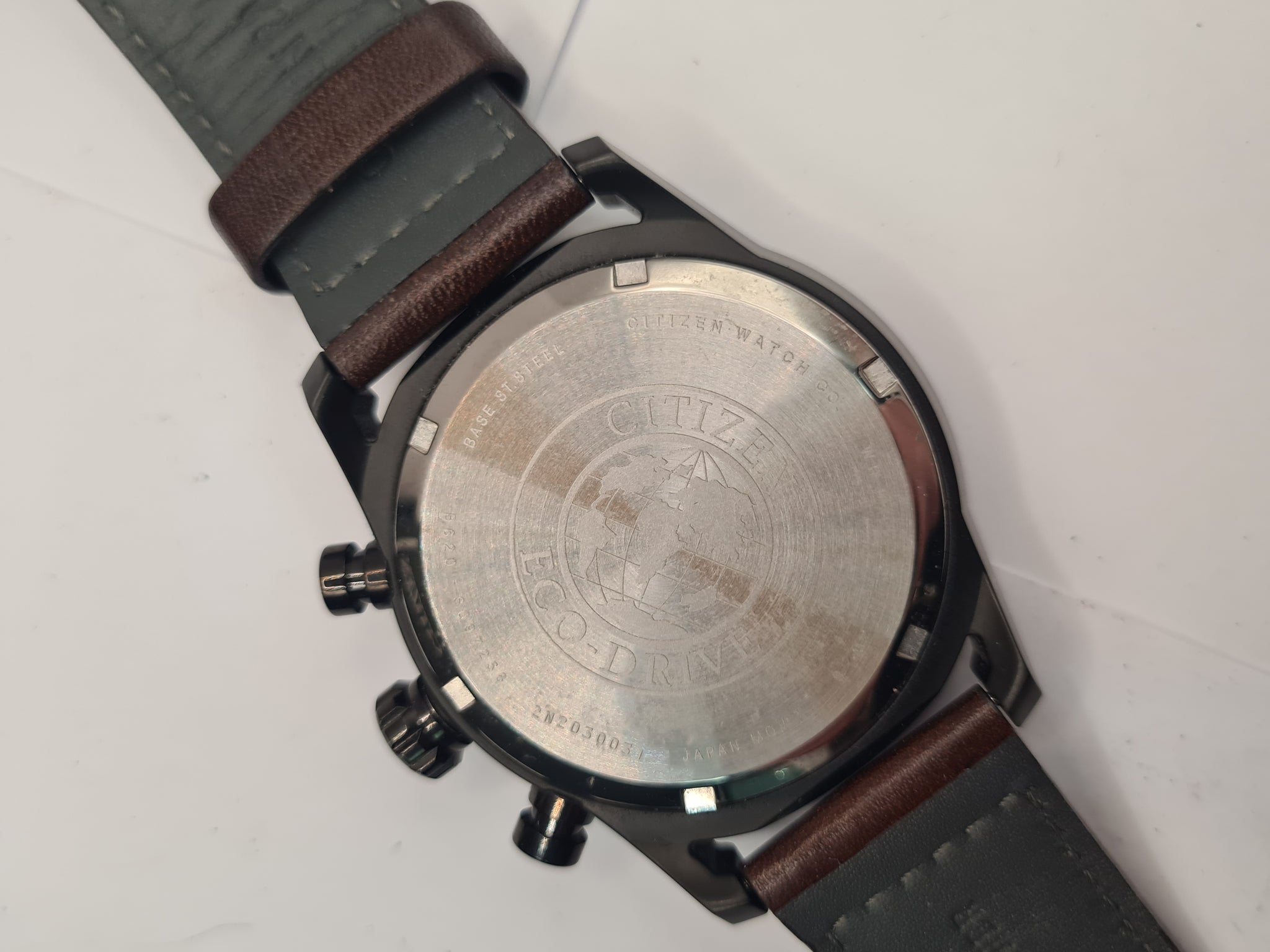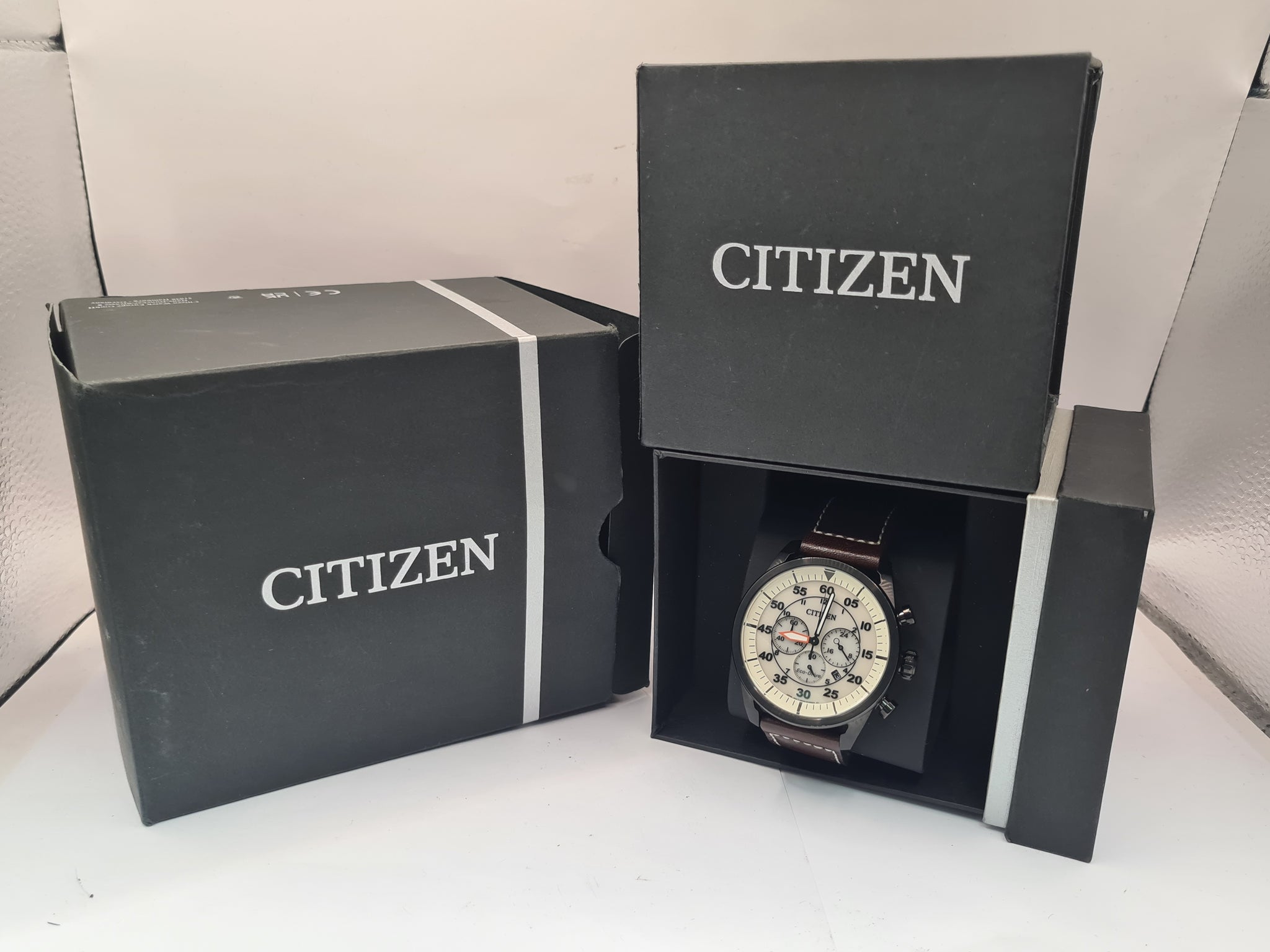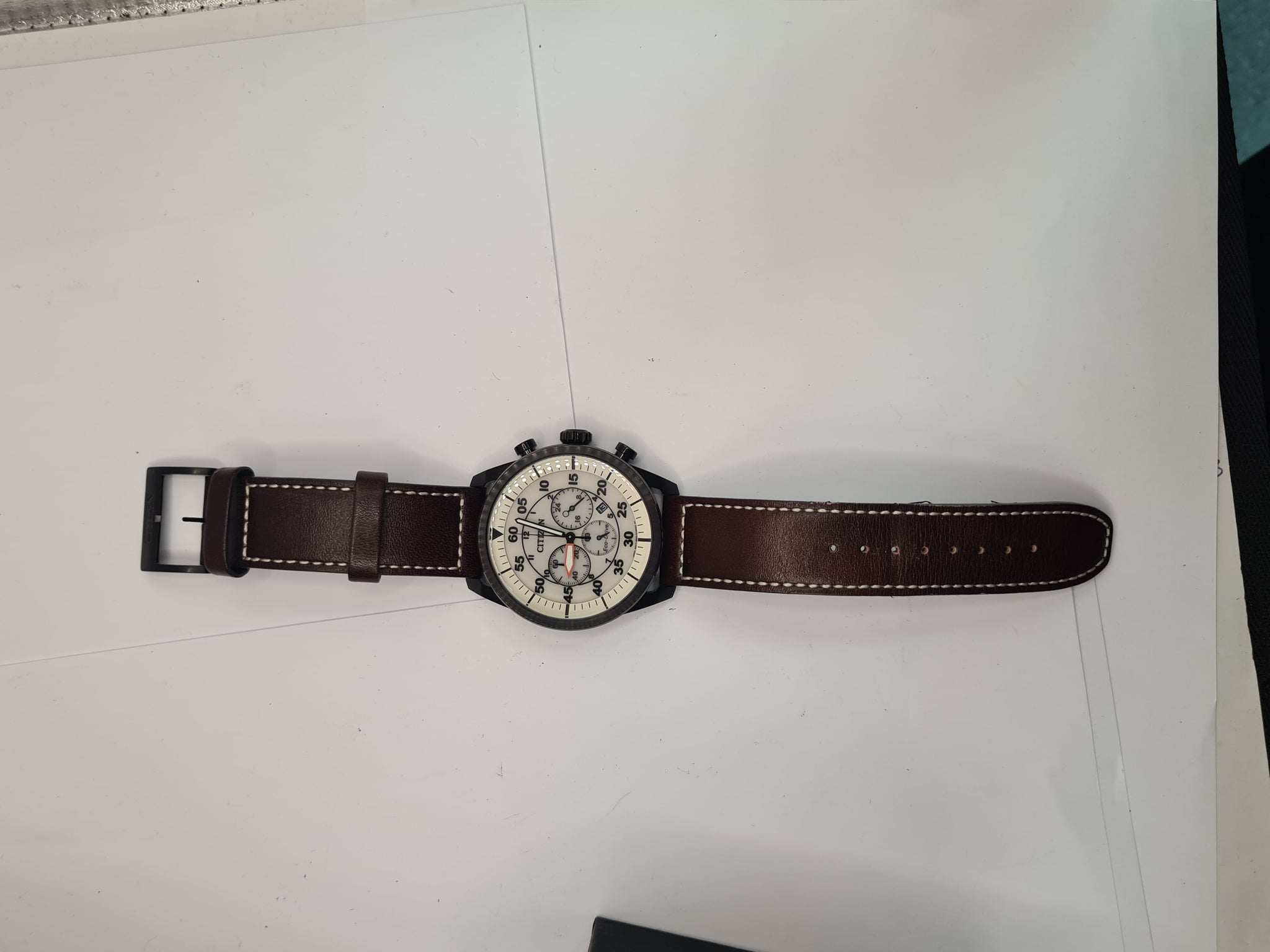 The Citizen CA4215-04W Eco-Drive Chronograph is a men's solar-powered watch with an aviator design, featuring a stainless steel case, a beige (or cream) dial, and a brown leather strap. Key Specifications Movement: Eco-Drive B620 (solar-powered quartz), never requires a battery change. Power Reserve: Approximately 9 months on a full charge, with an insufficient charge warning and overcharge prevention function. Case: Material: Black ion-plated stainless steel. Diameter: 45mm (approx. 44.8mm). Thickness: Approx. 13mm. Case Back: Screw-down. Dial: Beige (or cream/ivory) with luminous hands and index/Arabic numeral hour markers. Crystal: Mineral crystal (scratch-resistant). Strap: Dark brown genuine calf leather strap with contrast stitching and a pin buckle clasp. Water Resistance: 10 bar (100 meters / 330 feet), suitable for swimming, showering, and snorkeling. Functions: Chronograph (1/5-second stopwatch function, up to 60 minutes). Date display window. 12/24-hour time display. The watch typically comes in its original presentation box.
