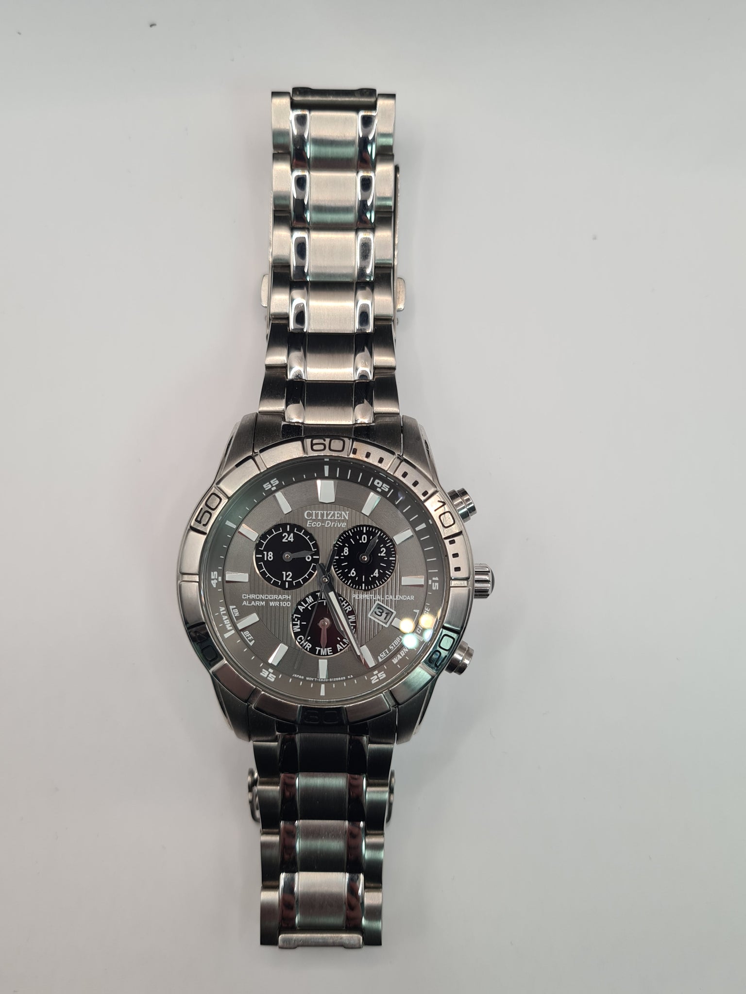 The Citizen Eco-Drive Brycen (BL5450-54H) is a men's chronograph watch that is primarily powered by light, so it never needs a battery. It features a perpetual calendar, a stainless steel case and bracelet, and is water-resistant to 100 meters. Key Specifications Feature Detail Source Movement Eco-Drive (Quartz, solar-powered) Caliber E820 Case Material Stainless Steel Case Diameter 44mm (approx. 43-44mm) Case Thickness 12mm (approx. 11.5-13mm) Dial Color Grey/Silver Crystal Mineral Crystal Band Material Stainless Steel Bracelet Water Resistance 100 meters (330 feet) Clasp Type Fold-over push-button deployant Functions & Features Eco-Drive Technology: Powered by any light source, artificial or natural, eliminating the need for battery replacements. A full charge can last for over six months in the dark. Perpetual Calendar: Automatically adjusts for odd and even months and leap years. Chronograph: 1/20 second chronograph measures up to 60 minutes. Alarm: Includes an alarm function. Dual Time Zone: Capable of displaying two different time zones. Luminous Accents: Luminous hands and markers for visibility in low light. 12/24 Hour Time: Supports both 12-hour and 24-hour time formats. The watch typically comes in its original presentation box with the manual and papers included.