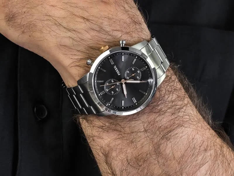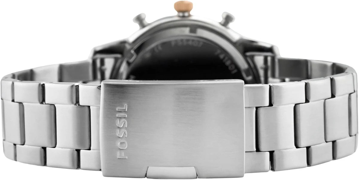 Sleek and sophisticated, this bold chronograph watch from Fossil will add a dapper touch to your look. The design exudes confidence with its 44mm-wide stainless steel case and a double sub-dial chronograph function. The watch offers a brushed finish and comes with a three-hand movement, including a contrasting seconds hand, and index hour markers. The watch fastens with a bracelet strap and a secure fold-over clasp.