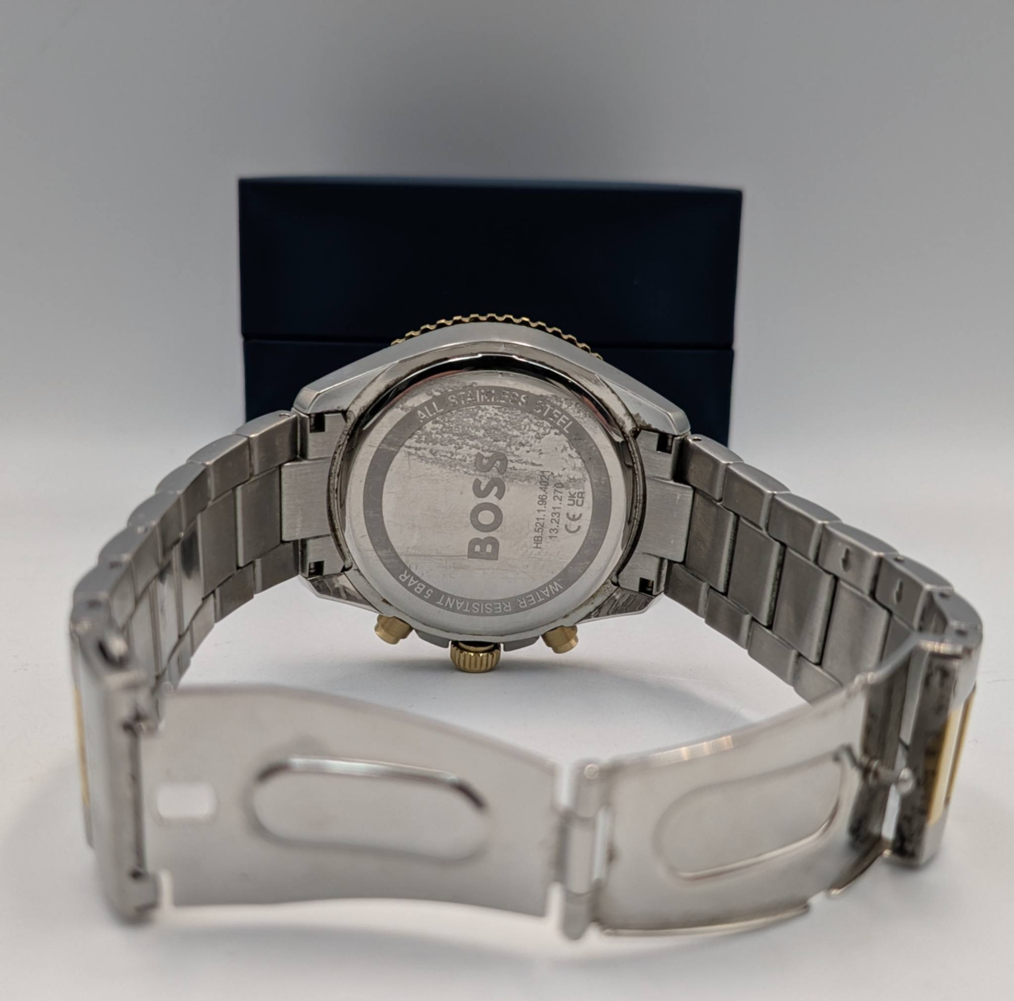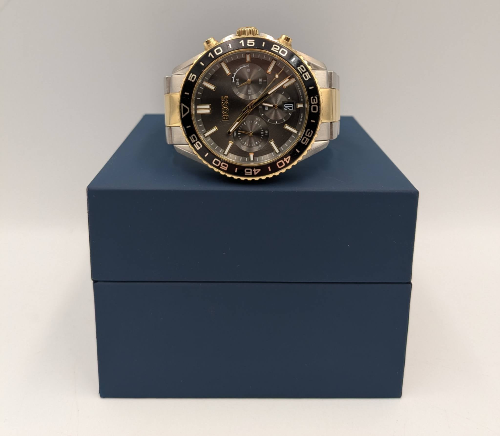BOSS Chronograph Runner 43mm Two Tone Mens Watch Grey Dial 1514144 Previously owned item, previous signs of use. Slight scratches to the bracelet of the watch, this does not effect the performance of the watch. Please use photos as reference.