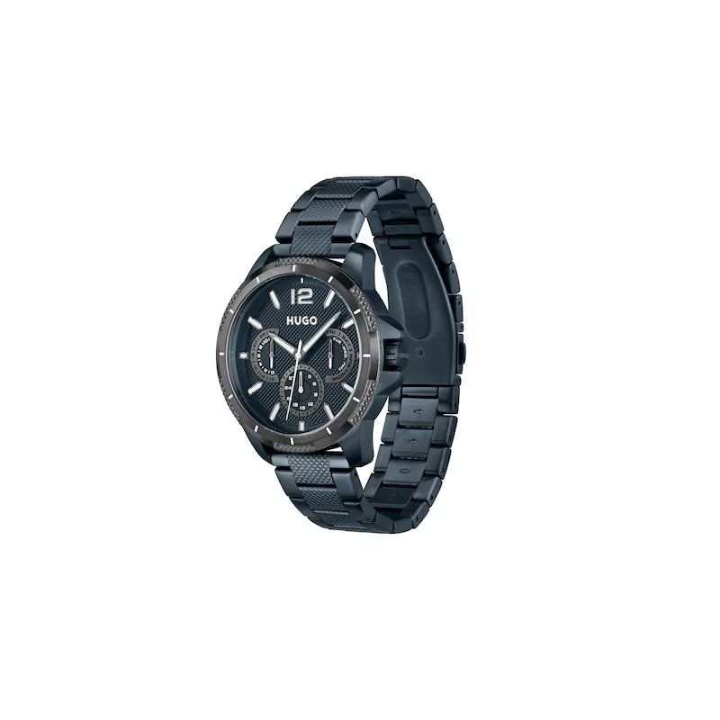 Introducing the #SPORT men's watch from HUGO. A modern and durable timepiece, crafted in bold blue IP and measuring at 48mm. The round case boasts a blue bezel, framing the matching dial with day, date and 24hr counters, baton markers and HUGO logo beneath the 12-o-clock mark. This BOSS watch is powered by quartz movement for reliable timekeeping at every second of the day. A co-ordinating blue ion-plated bracelet completes this watch. Smart style for men on the move.