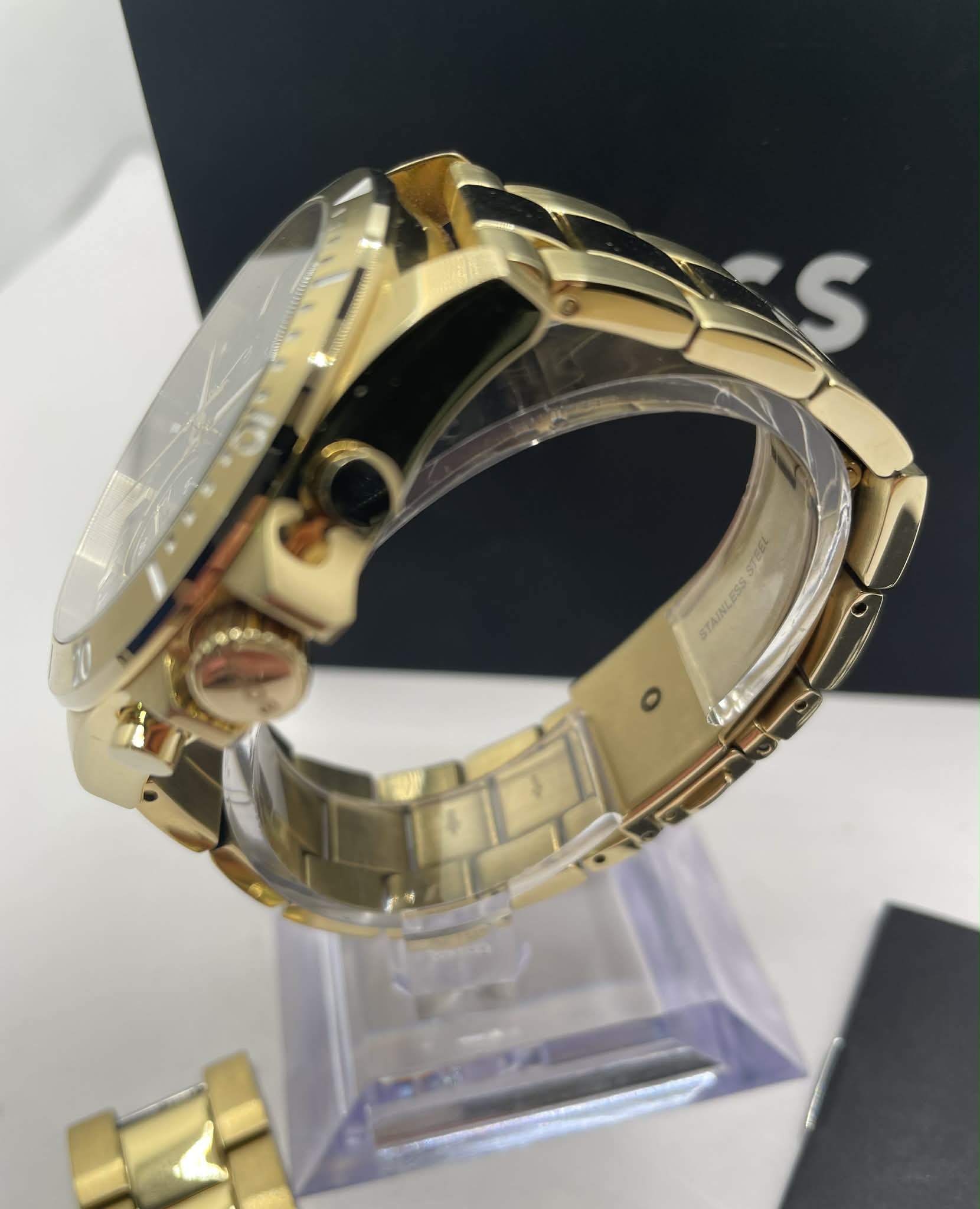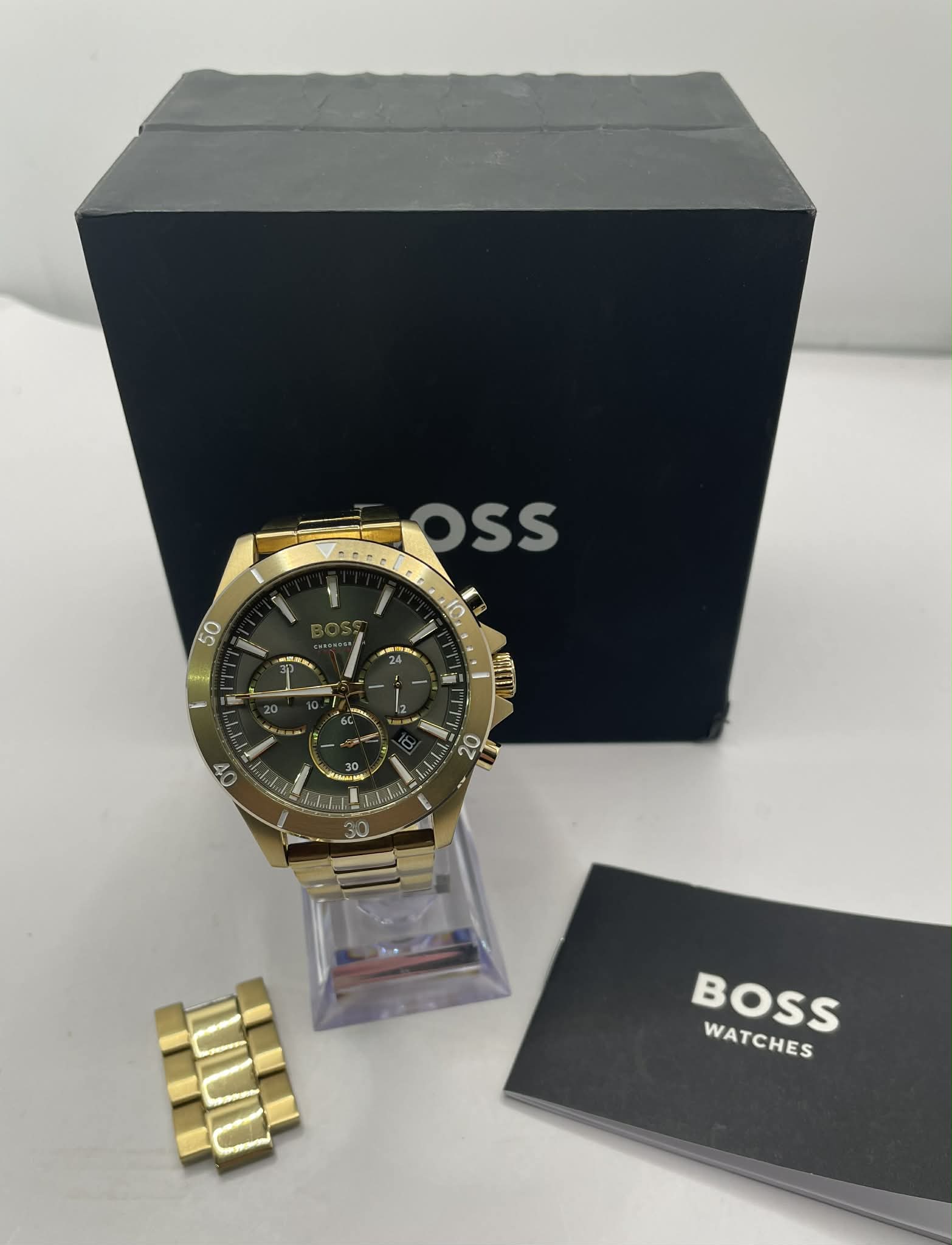 Hugo Boss watch - chronograph Water resistant 5 bar / All stainless steel Comes with the box and links. Minor cosmetic wear, otherwise good working condition.