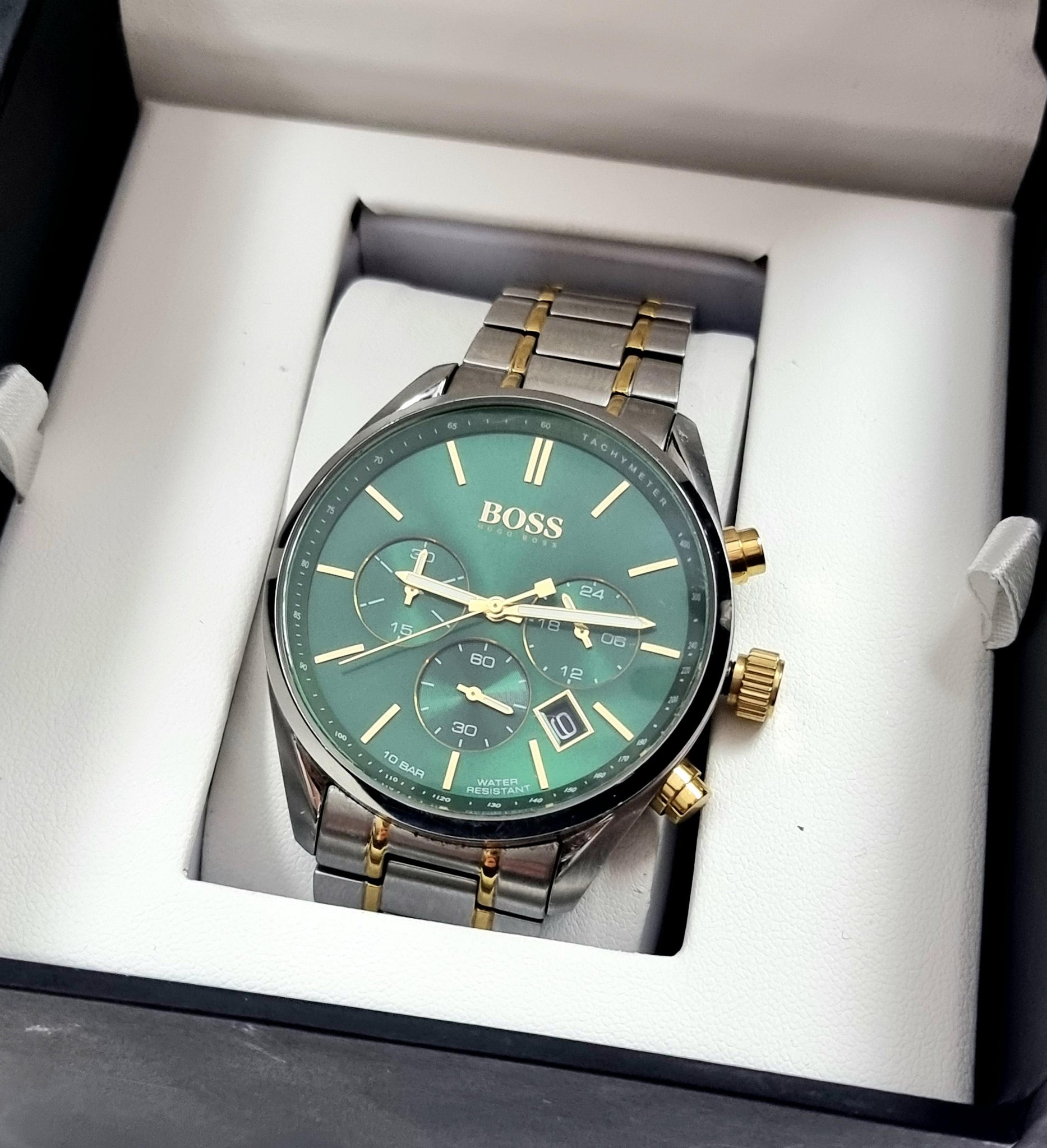 NEW HUGO BOSS 1513878 MEN'S STAINLESS STEEL TWO-TONE STRAP & GREEN DIAL 44MM