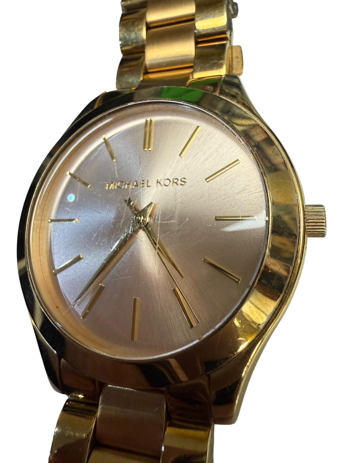 Michael Kors MK3493 Slim Runway Women's Watch is in good condition, front face is scratched and marked.