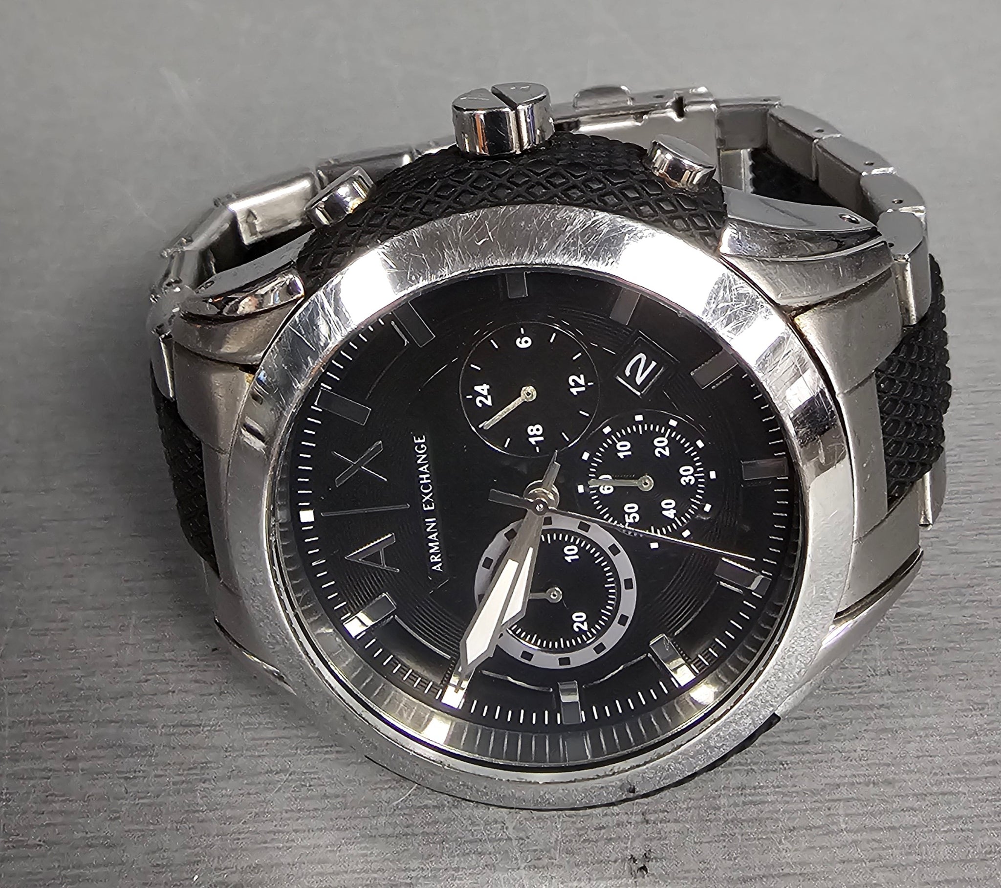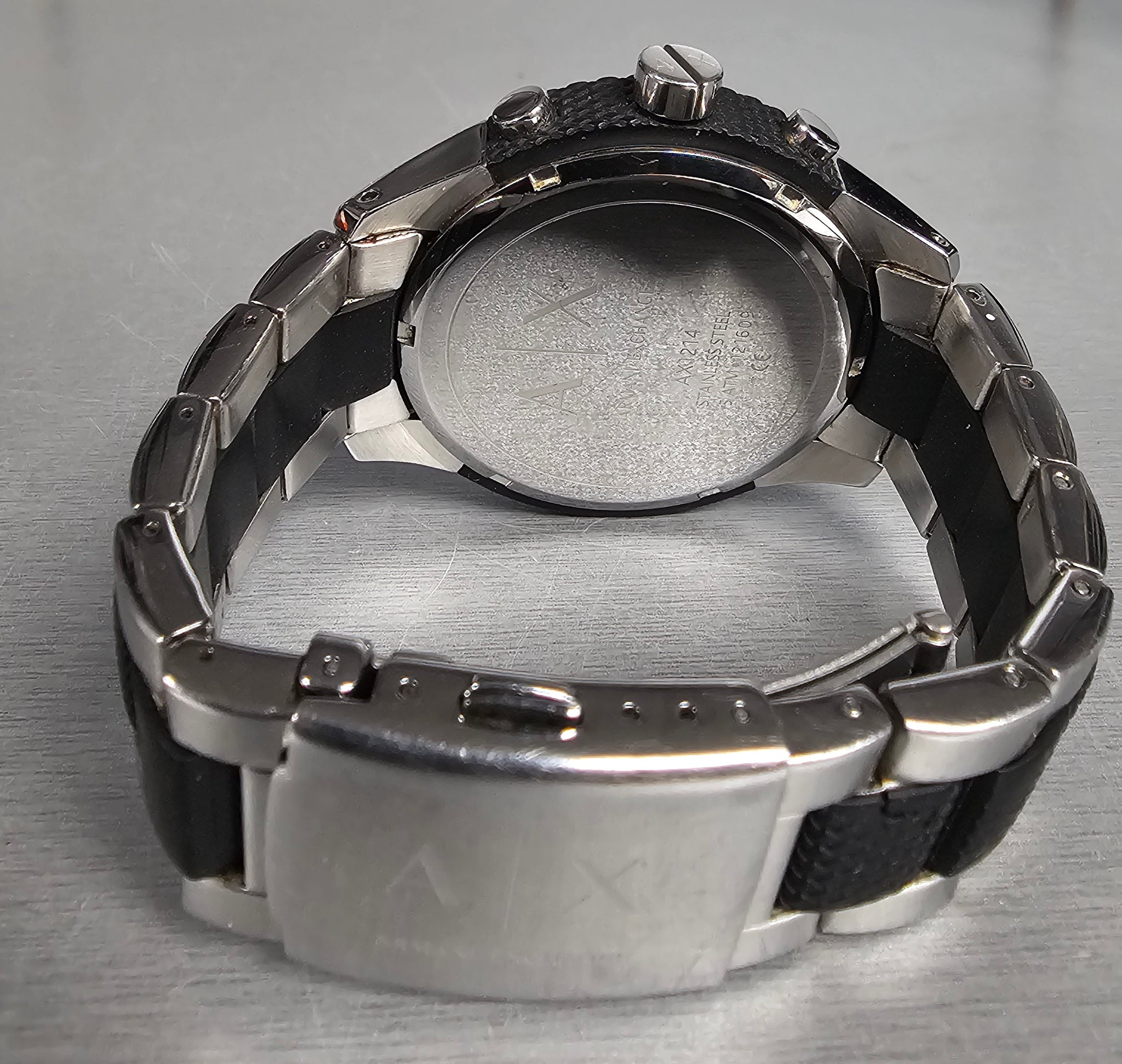 Limited edition No Movement Quartz Case Material Stainless Steel Case Colour Silver Glass Mineral Minute Marker Index Dial Colour Black Clasp Type Push Button Fold Over Clasp Water Resistance 50 metres Day No Date Yes Chronograph Yes Alarm No Features Date, Chronograph, 24 Hour Dial Extra Features Rubber inserts in bracelet and case sides Case Width (mm) 46 Case Depth (mm) 13 Alternative Model No. AX-1214 Packaging Original Armani Exchange Packaging Guarantee 2 Year Armani Exchange Guarantee Maximum wrist size (cm) (Approx.) 20 Bracelet Adjustable Yes Strap Colour Silver Face Shape Round Strap Type Bracelet