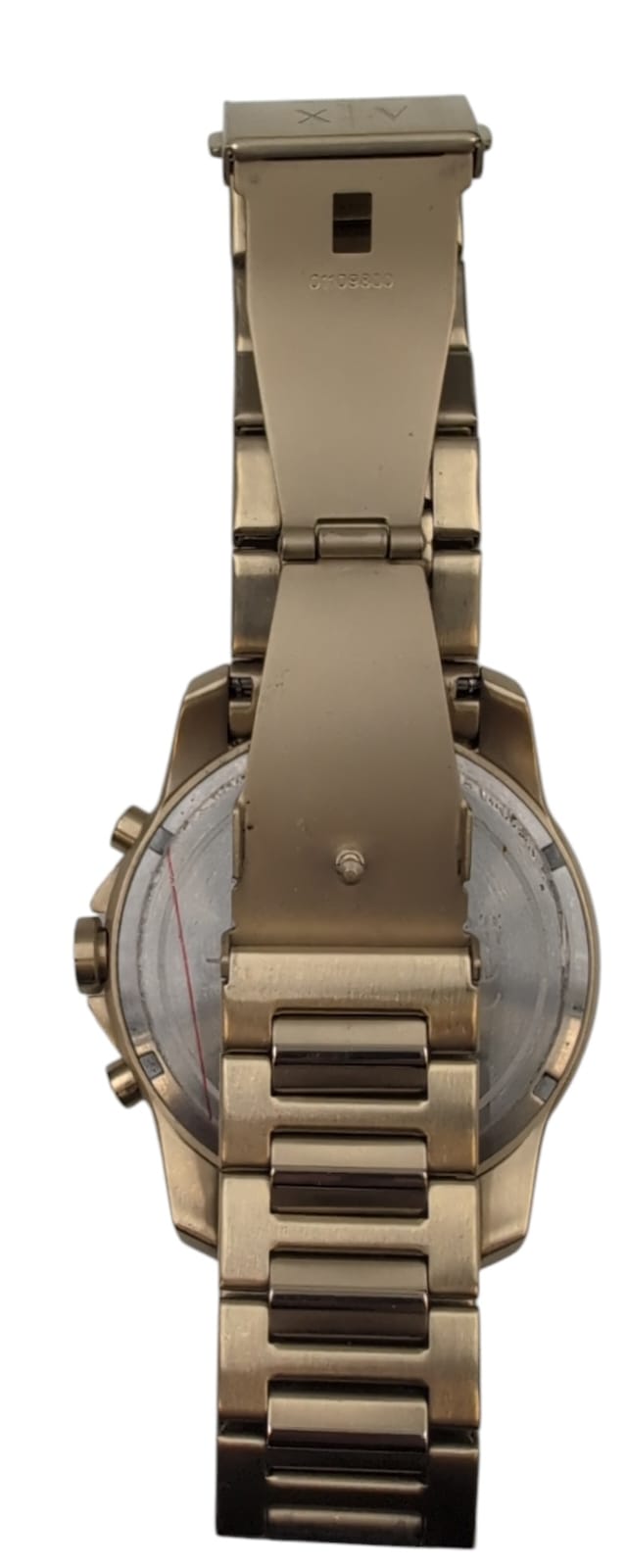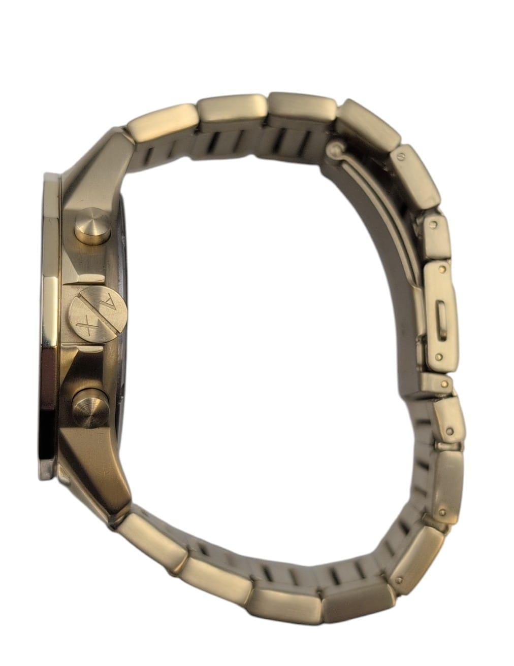 Armani Exchange Men's Silver Chronograph Dial Gold Stainless Steel Bracelet Watch. Comes with original box, box has scratching and marks. Watch is is in good condition, face has no scratching and marks, Bracelet has light scratching and marks. Used. Collection and delivery available.
