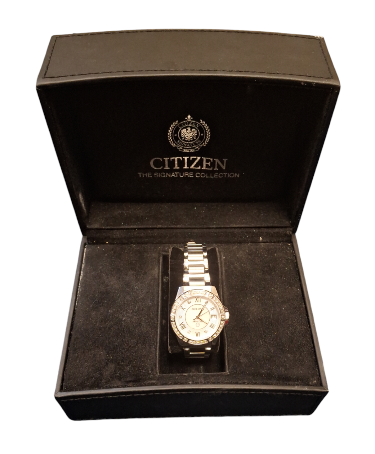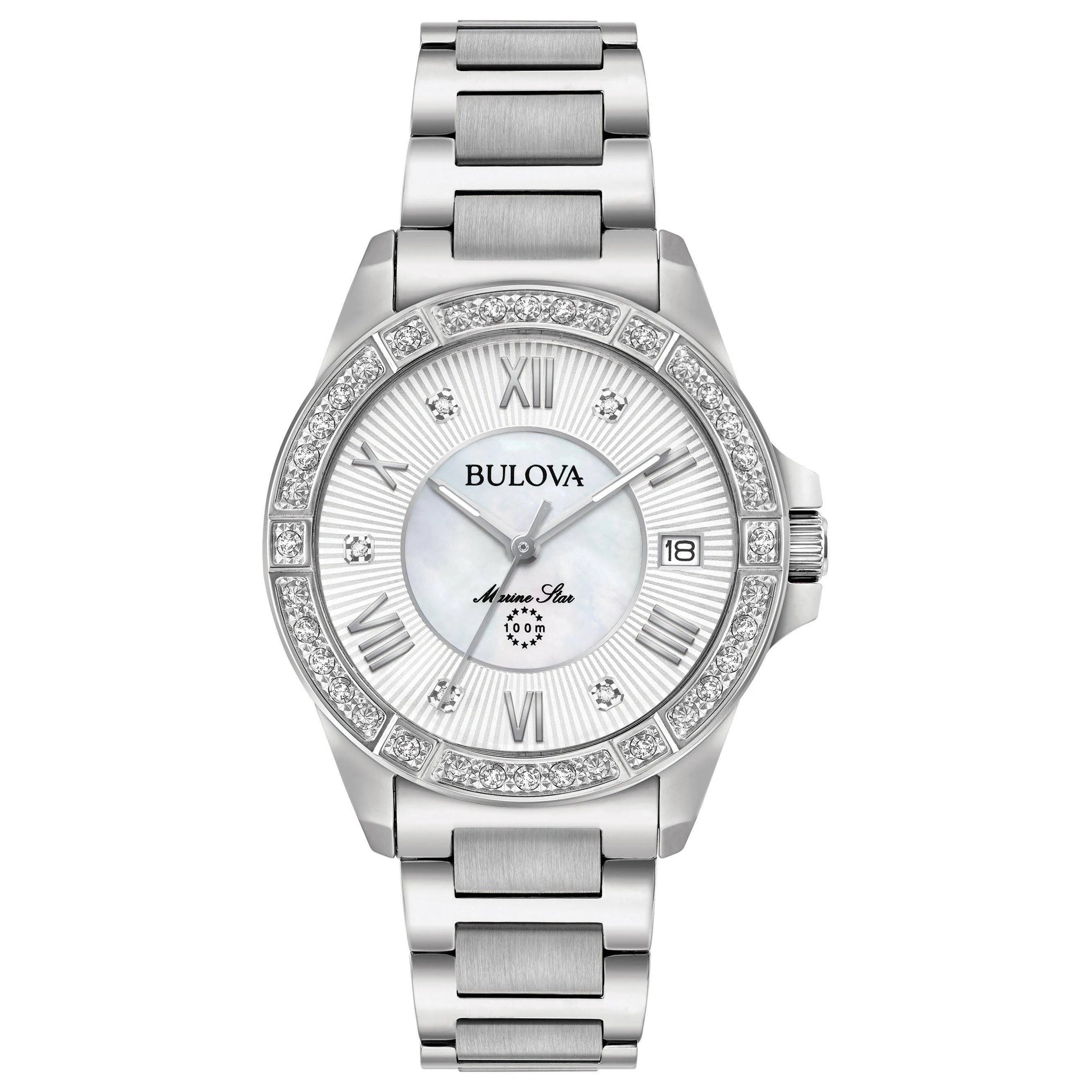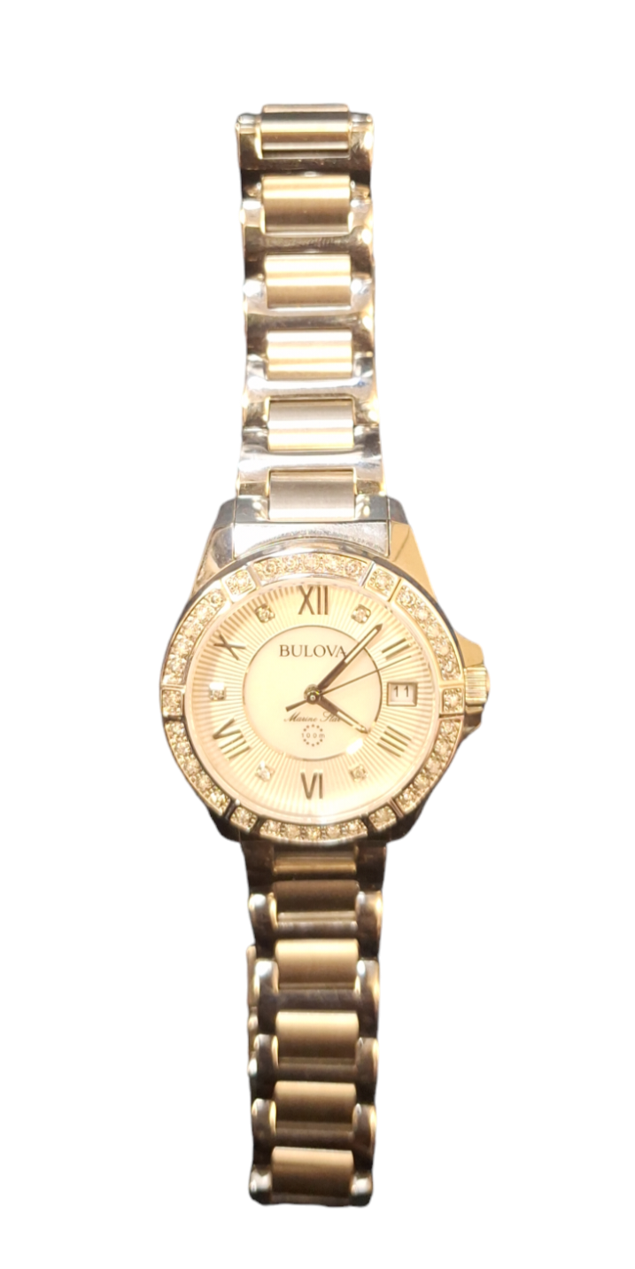A luxurious and weighty ladies Bulova Marine Star watch, so classic of the Bulova brand. The 31 x 10mm stainless steel case features a lined silver outer dial with mother of pearl inner dial, silver dial accents, a date window at 3 o'clock, luminous hands plus genuine diamond hour markers and stunning bezel. Finished with an adjustable steel bracelet with push button clasp. Presented in a Bulova watch box. 100m water resistant.