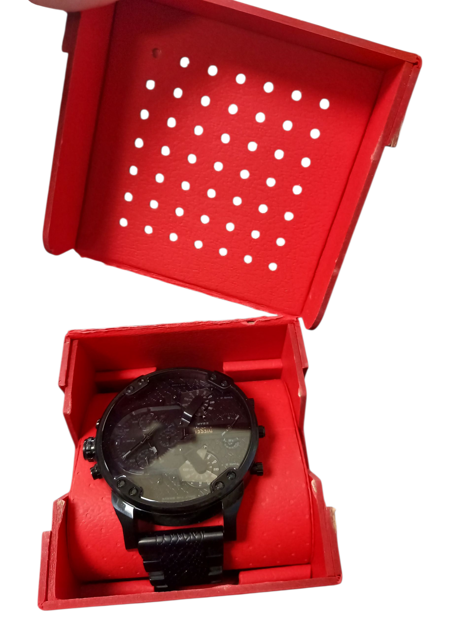 Men's Diesel Mr Daddy 2.0 DZ7468 Stainless Steel Watch The Diesel Mr Daddy 2.0 DZ7468 watch is a robust and stylish accessory designed for the modern man. With its strong stainless steel build and bold aesthetics, this watch is a true statement piece. Perfectly crafted for those who appreciate a blend of functionality and fashion, the Mr Daddy 2.0 collection never fails to impress. Design and Build The Diesel Mr Daddy 2.0 DZ7468 features a solid stainless steel case and band, ensuring durability and long-lasting wear. The watch boasts a striking black dial with contrasting red and white accents, making it an eye-catching accessory. Its large case size is not just for show; it underscores its bold design, perfect for making a lasting impression. Features and Functions This Diesel watch offers multiple time zone functionality, making it an excellent choice for frequent travelers or those who work internationally. The chronograph feature enhances its utility, providing precise timekeeping for various activities. Additionally, the watch is water-resistant up to 3 ATM, protecting it against minor splashes and rain. Comfort and Wearability Despite its hefty appearance, the Diesel Mr Daddy 2.0 DZ7468 has been designed with wearability in mind. The stainless steel band is adjustable, providing a secure and comfortable fit for wrists of all sizes. The watch's innovative clasp ensures it stays in place throughout the day, giving you peace of mind.
