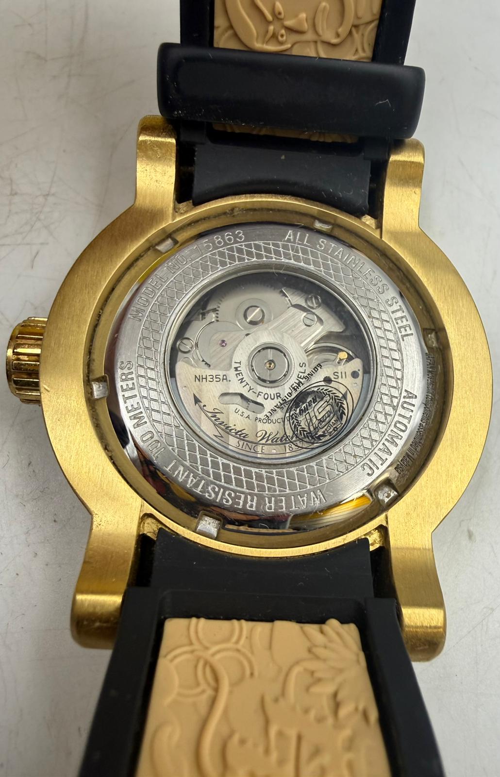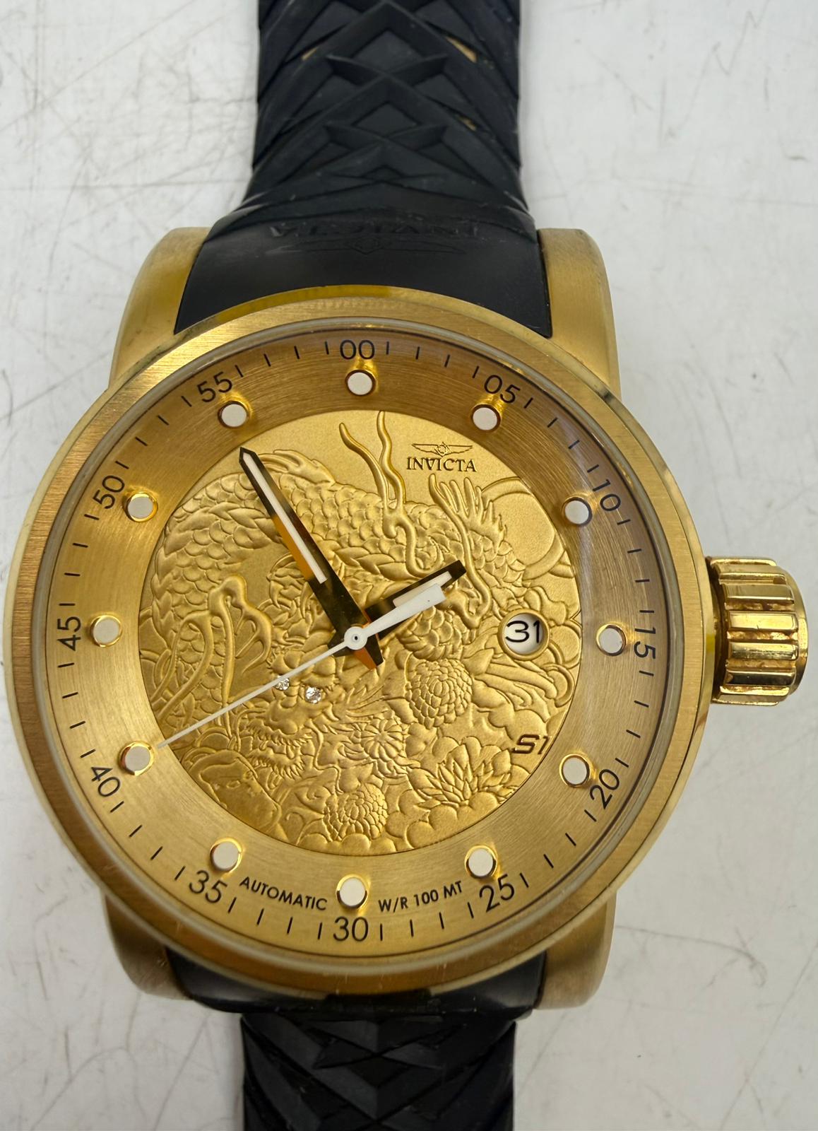 Invicta 15863 men's S1 Rally yellow gold steel black strap automatic watch is offered, in a yellow gold plated solid stainless steel case. This model is made in dimensions of 48mm across and 15mm high. This watch has a fixed bezel and a textured push/pull main crown. Invicta 15863 is equipped with a black rubber strap. Securing the strap is a pin buckle clasp made in stainless steel. The dial is gold tone and it features conservatively sized, dot hour markers and gold tone luminous pencil shaped hands for optimum readability. Invicta 15863 also features a date display window. This timepiece has a mineral crystal for scratch resistance. Powering this amazing model is a Japanese NH35A automatic movement with 24 jewels. The water resistance comes in at 100 meters.