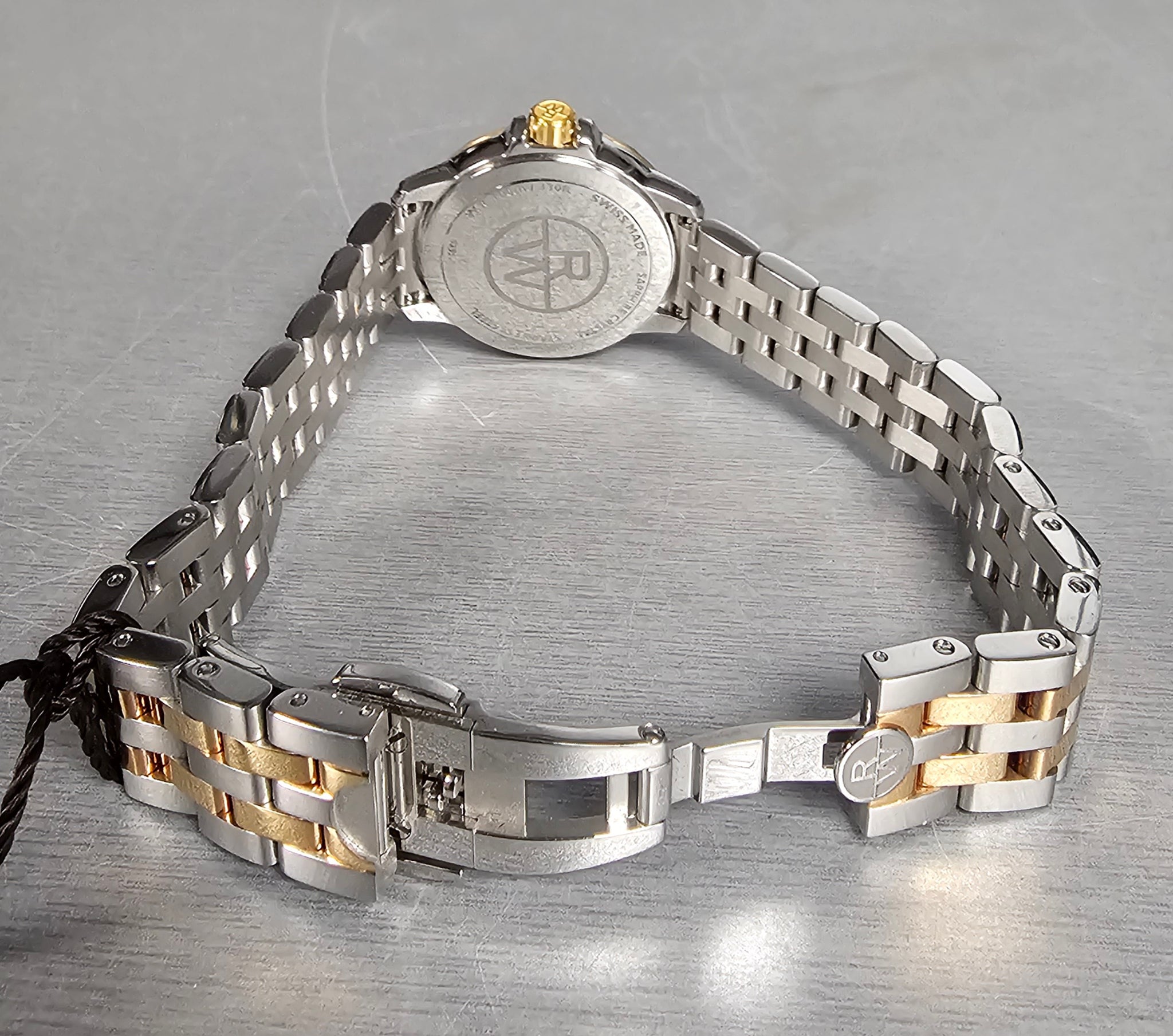 Raymond Weil Genève is a Swiss luxury watchmaker, founded in 1976 in Geneva. It is a family company founded by Raymond Weil and Simone Bédat.The company was carried along by Weil’s passion for creating traditional Swiss watches with a difference.Raymond Weil Tango collection ladies stainless steel and yellow gold PVD bi-colour bracelet watch with stainless steel case. Round mother of pearl dial with yellow gold tone hands, roman numerals and diamond dot dial encompassing 8 diamonds weighing a total of 0.02ct. Swiss made quartz movement with sapphire crystal glass and water resistant up to 100 metres.