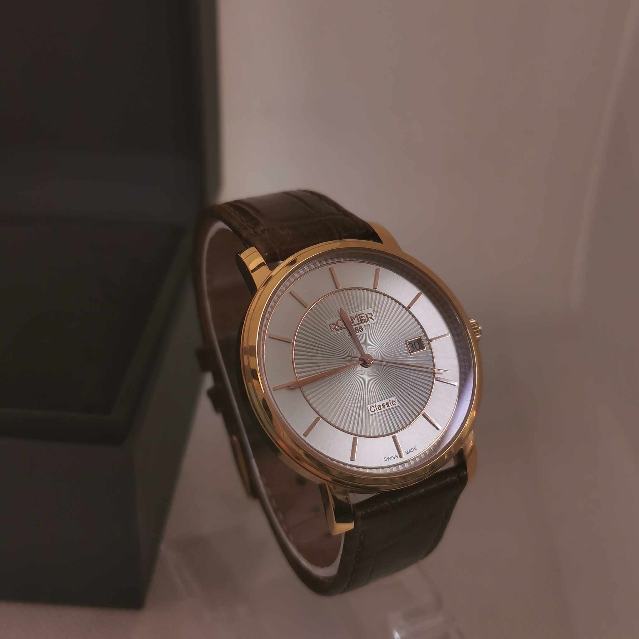 The Roamer is a handsome Swiss made timepiece with gold plated case and white dial. This luxury watch with an internal Swiss made movement has sapphire crystal scratch resistant glass and a date window set in the 3 position. This model has great aesthetics and a luminous dial. The strap is a luxurious deep brown/burgendy leather and this model is water resistant to 50M.
