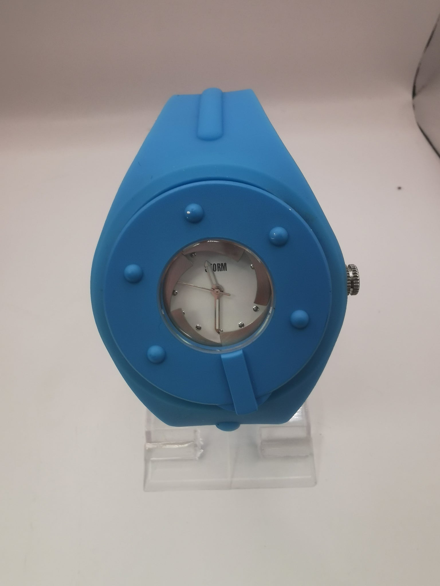 The STORM X-Cam Blue watch (product code 47059/B, sometimes referred to as the Cam X) is a unique, water-resistant timepiece known for its bold design and blue silicone strap. It is marketed as a unisex watch. Key Features Design & Display: The watch features a white dial, blue silicone strap, and is known for its bold, contemporary look. Movement: It operates on a reliable quartz movement. Materials: The case is made from stainless steel and plastic/resin, while the dial window is protected by mineral glass. Water Resistance: It is marked as water-resistant, meaning it can withstand slight splashes and rain, but should not be immersed in water (Water Resistance: X or Splash).