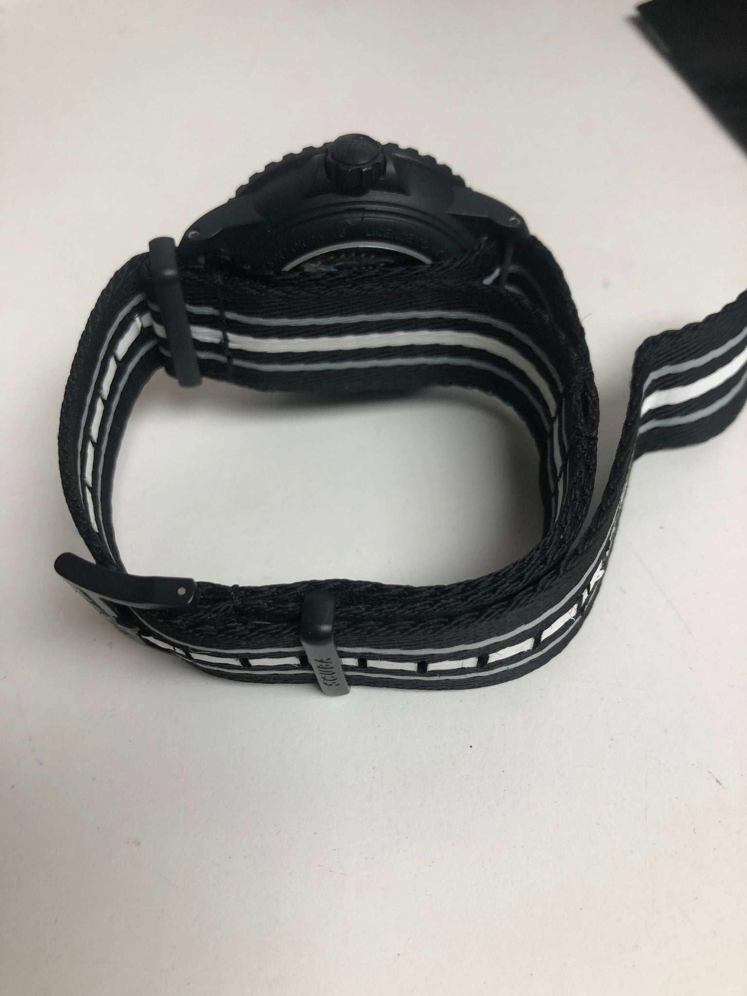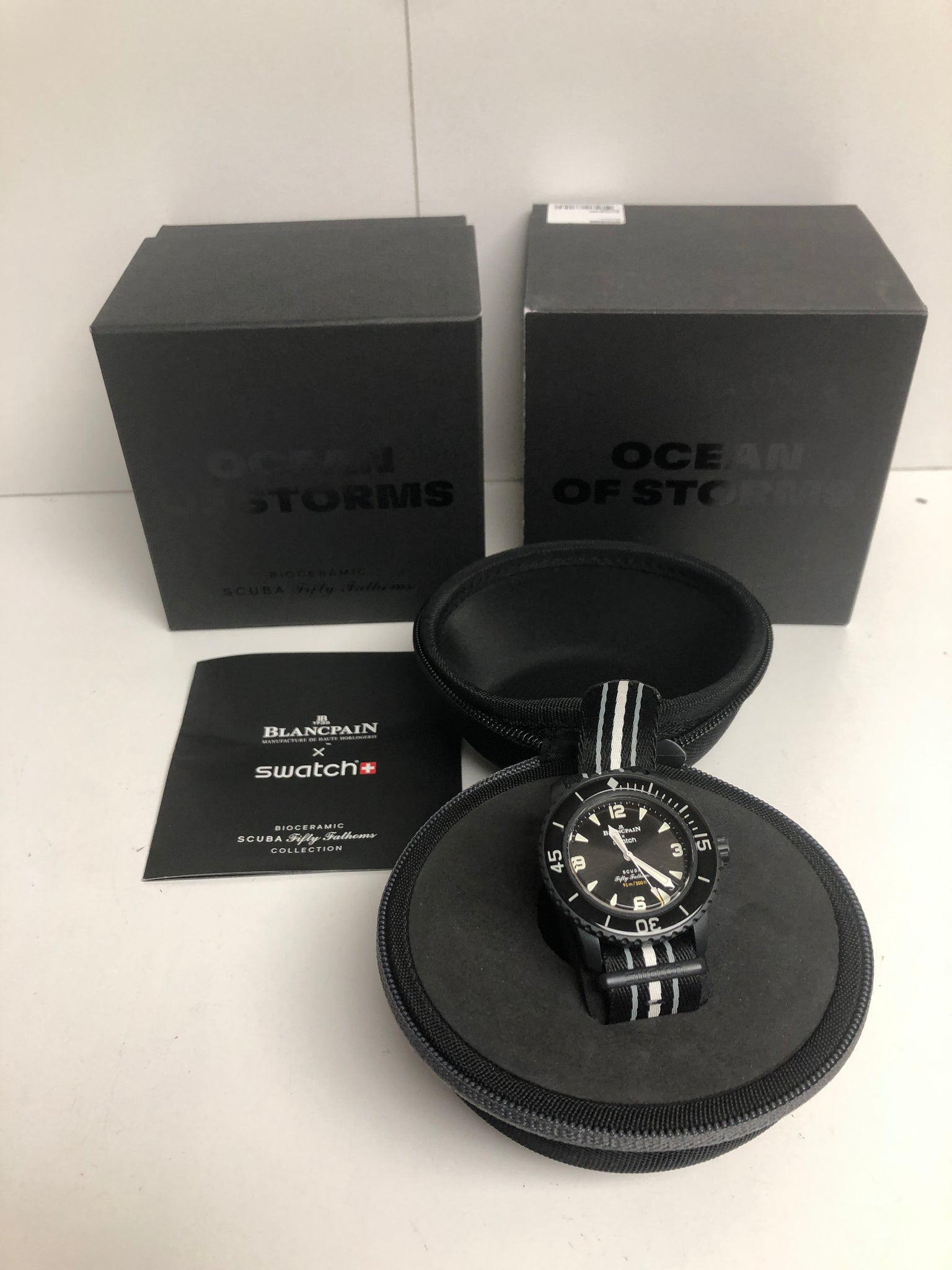 This Blancpain X Swatch watch honors Blancpain’s Fifty Fathoms, the first true diver’s watch. Its black case and crown are made of Bioceramic material. The word “Swatch” is inscribed on the outer left side of the case. The dial has a black sunbrushed finish and features a date indicator between 4 and 5 o'clock. The hour indexes, hour, and minute hands, as well as the scale on the bezel, are enriched with Grade A Super-LumiNova for outstanding legibility in the dark. boxed, good condition