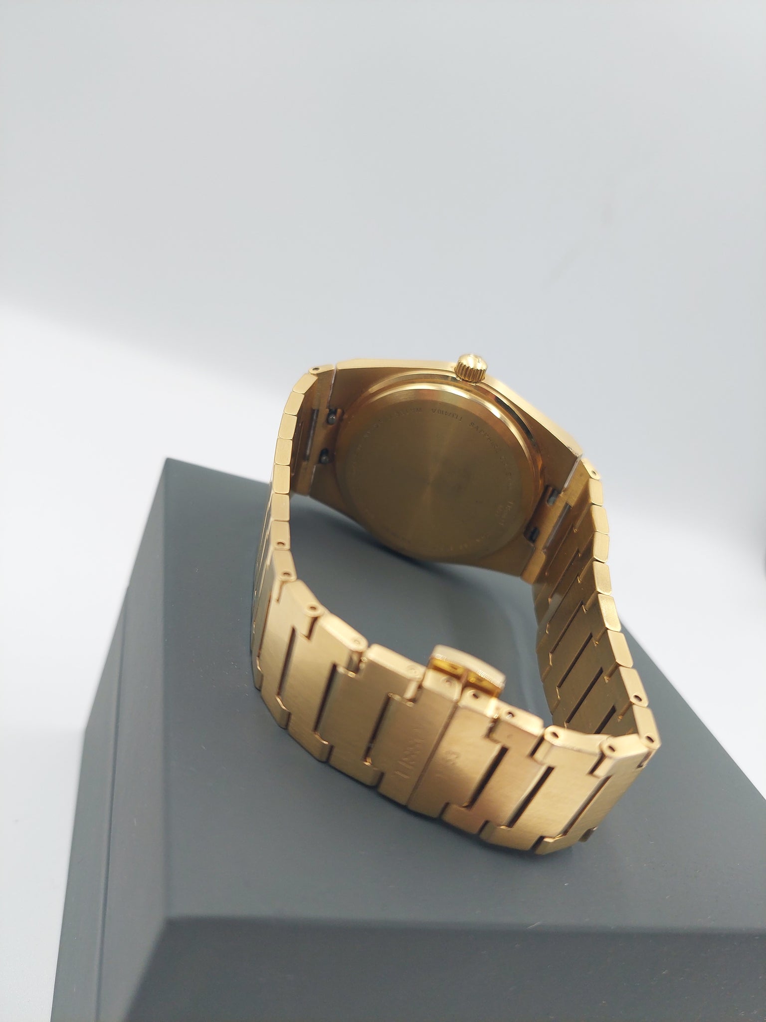 WATCH IS GOLD COLOUR- STAINLESS STEEL. The Tissot 1853 PRX in gold and stainless steel typically refers to the Tissot PRX models with a gold PVD coating on a stainless steel case and bracelet, featuring a gold dial and a Swiss quartz or automatic movement. These watches have a vintage '70s-inspired design with a slim, tonne au-shaped case and are water-resistant to 100 meters. Key features include a sapphire crystal, a date window at 3 o'clock, and a quick-release, interchangeable bracelet.