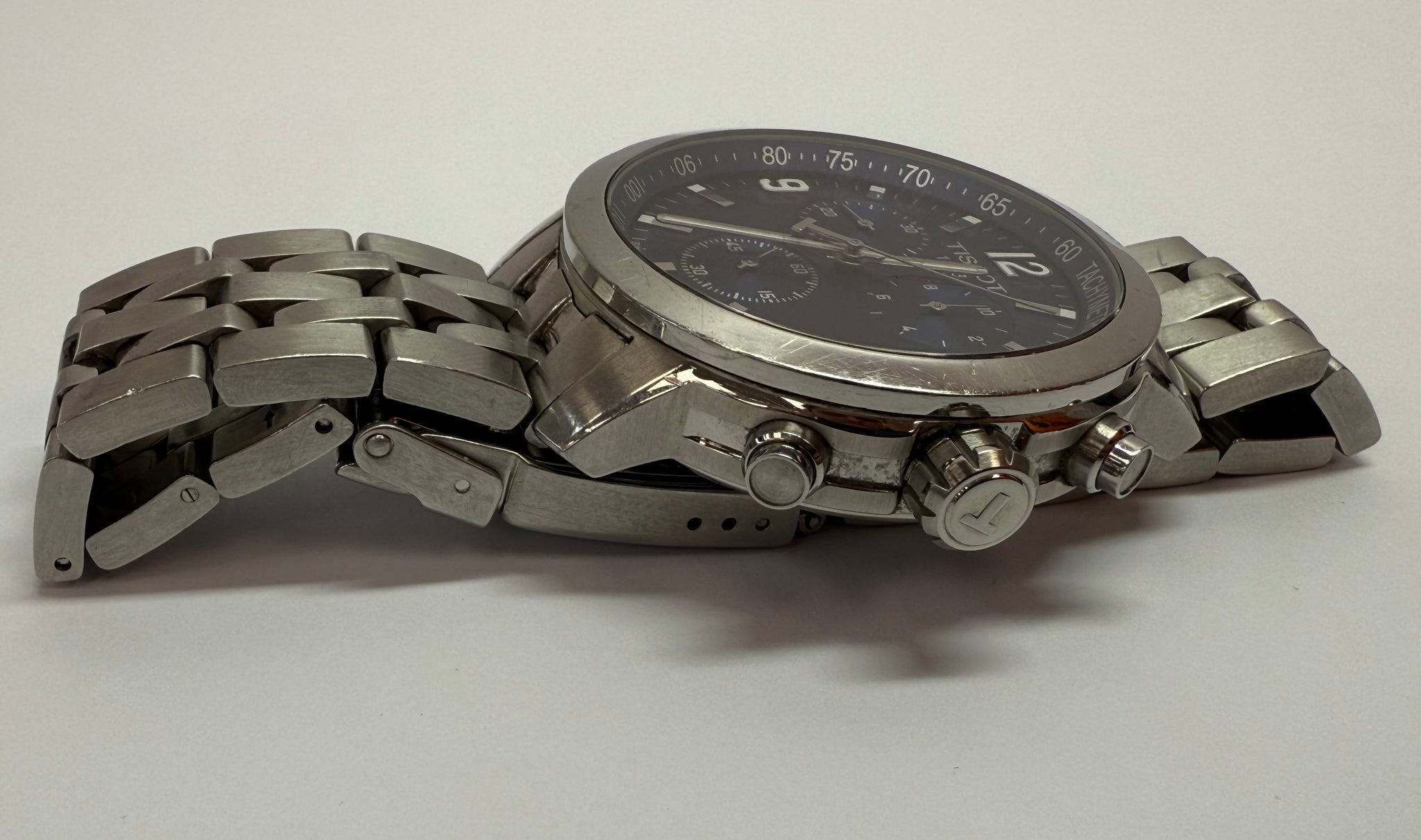 Designed with a smaller bezel to enhance the appearance of the dial, the PRC 200 provides a modern look and clear view of the time. The sleek 43mm round stainless steel case is also fitted with a screw-down tachymeter, crown and engraved caseback. The bold blue chronograph dial boasts a distinct display offering the utmost precision in your timekeeping. Inspired by the Tissot PRS 200 collection, the brand wanted to give this line a more classic look whilst still maintaining the sporty style. This model is powered by Swiss-made Quartz movement, and is finished with a co-ordinating sturdy stainless steel bracelet. This Tissot men's watch is water resistant up to 200 metres. Item Location This item is available for Collection or Delivery from: Cash Generator Leigh, 59 Bradshawgate, Leigh, WN7 4NB Email: leigh@cashgenerator.co.uk Telephone: 01942410620 Item Condition Condition: Pre-Owned: Grade B This beautiful Tissot PRC 200 Chronograph watch comes unboxed with no spare links, has slight small signs of use. Item Description Designed with a smaller bezel to enhance the appearance of the dial, the PRC 200 provides a modern look and clear view of the time. The sleek 43mm round stainless steel case is also fitted with a screw-down tachymeter, crown and engraved caseback. The bold blue chronograph dial boasts a distinct display offering the utmost precision in your timekeeping. Inspired by the Tissot PRS 200 collection, the brand wanted to give this line a more classic look whilst still maintaining the sporty style. This model is powered by Swiss-made Quartz movement, and is finished with a co-ordinating sturdy stainless steel bracelet. This Tissot men's watch is water resistant up to 200 metres.