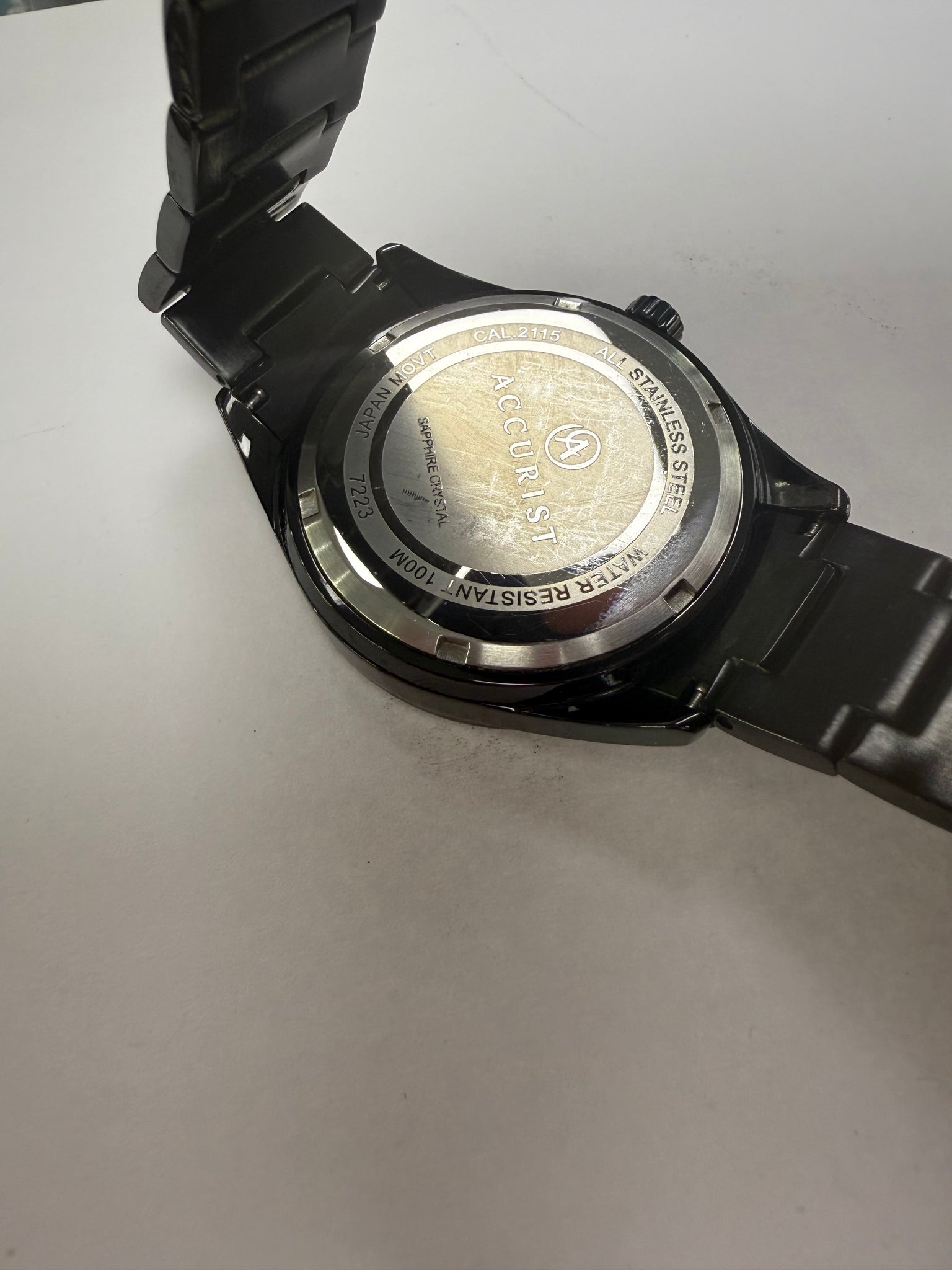 Accurist watch (CAL_2115) made from stainless steel in a sleek black colour. The watch comes boxed with 2 spare links, a bracelet adjustment guide and instruction booklet.