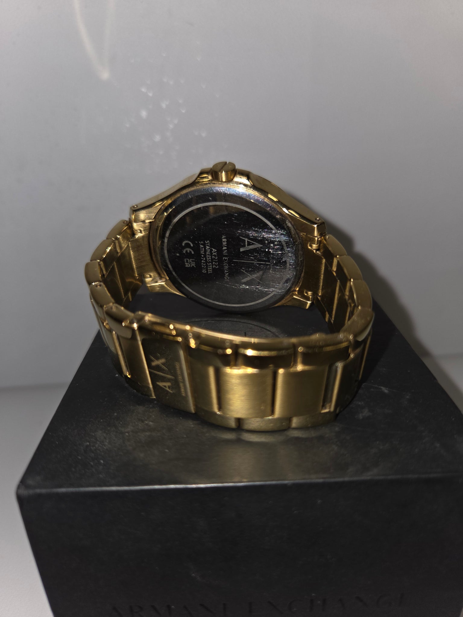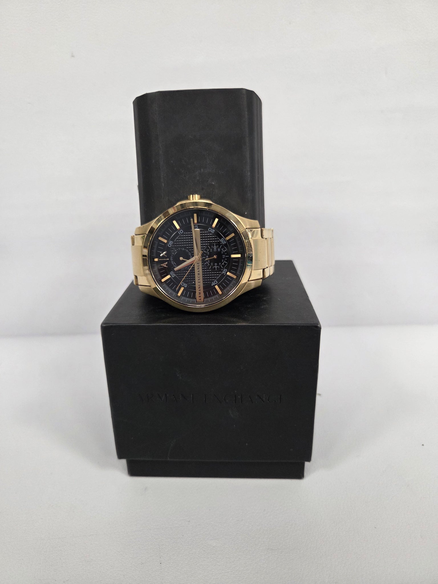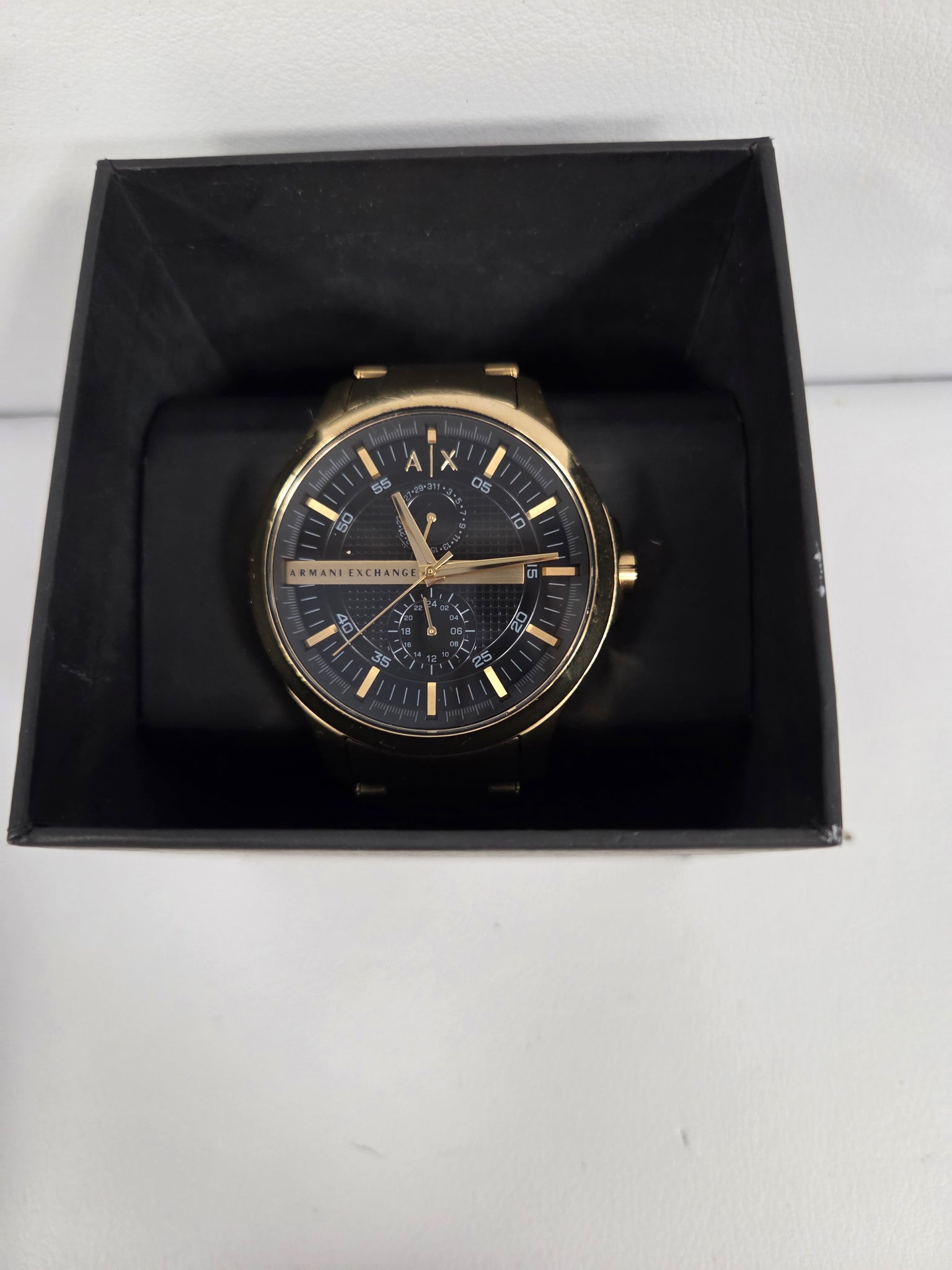 Unleash your style with the Armani Exchange Gold SS Quartz Chronograph Men’s Watch Mod. AX2122, a stunning timepiece that exudes sophistication and elegance. ? Embrace luxury with this gold stainless steel watch that perfectly complements any outfit. Water – resistant up to 5 ATM, allowing you to wear it confidently in everyday situations. The masculine 48mm case size makes a bold statement on any wrist. Crafted from durable stainless steel IP gold case and strap material for a luxurious look and feel. Powered by a reliable quartz movement for accurate timekeeping. Features a chronograph function for precision timing. The mineral dial material enhances durability and scratch resistance. Arrives in an official box for a touch of exclusivity.How to Use: 1. Adjust the time by pulling out the crown to the desired position and rotating it clockwise or counterclockwise. 2. Use the chronograph function by pressing the side buttons to start, stop, and reset the stopwatch. 3. Avoid exposure to extreme water conditions beyond 5 ATM to maintain the watch’s longevity.Make a statement with the Armani Exchange Gold SS Quartz Chronograph Men’s Watch Mod. AX2122 – a fusion of style, functionality, and luxury!