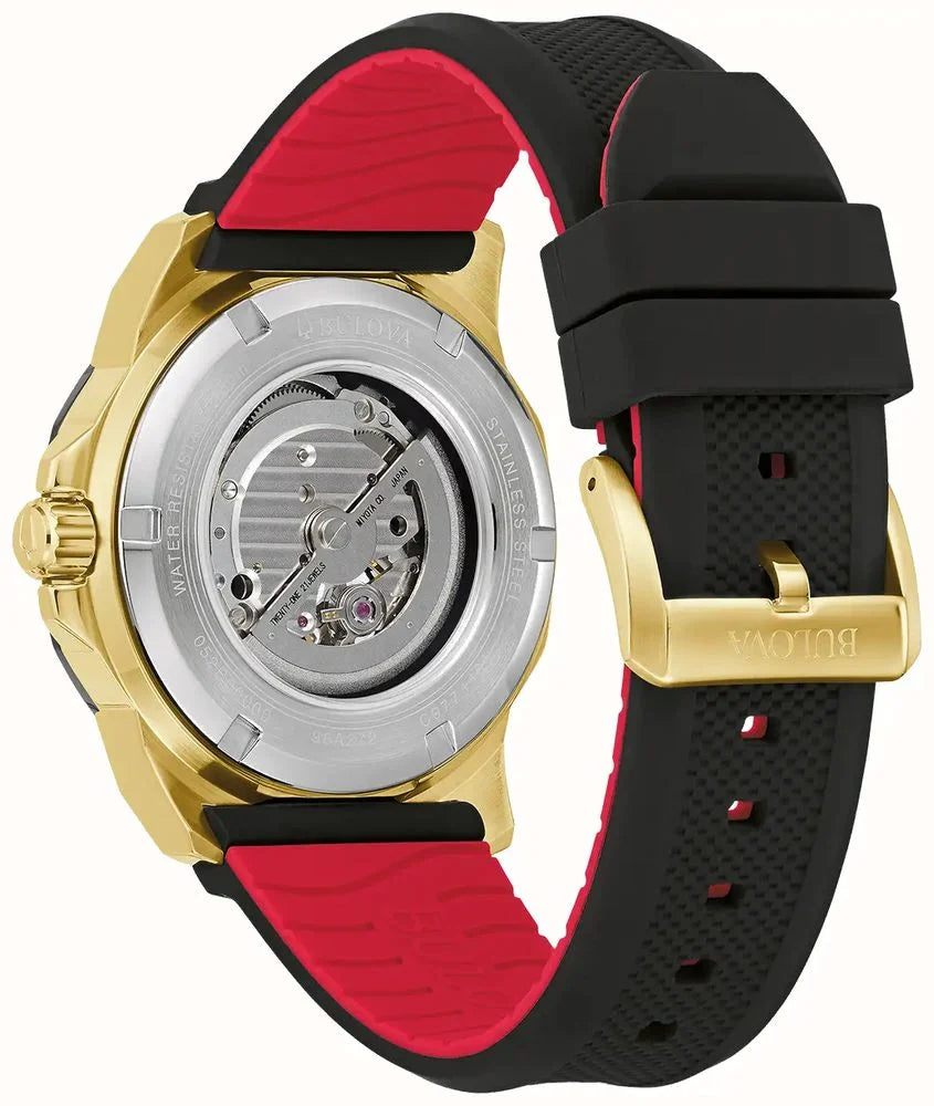 Bulova Bulova Men's Marine Star Automatic Black Dial / Black Silicone Strap Model Specifications 98A272: This watch is part of the brand's Marine Star Automatic Collection. The timepiece features a black dial with one sub-dial and a cut-out feature. The dial exhibits gold Roman numeral and baton indices with gold hour and minute hands. Mineral crystal protects the dial. The gold-tone stainless steel case features black details and measures 45mm in diameter. It features an exhibition case back. This watch is secured on the wrist using a black silicone strap that fastens using a pin buckle. An automatic movement powers this timepiece. This model is water resistant up to 200 metres (20 bar).
