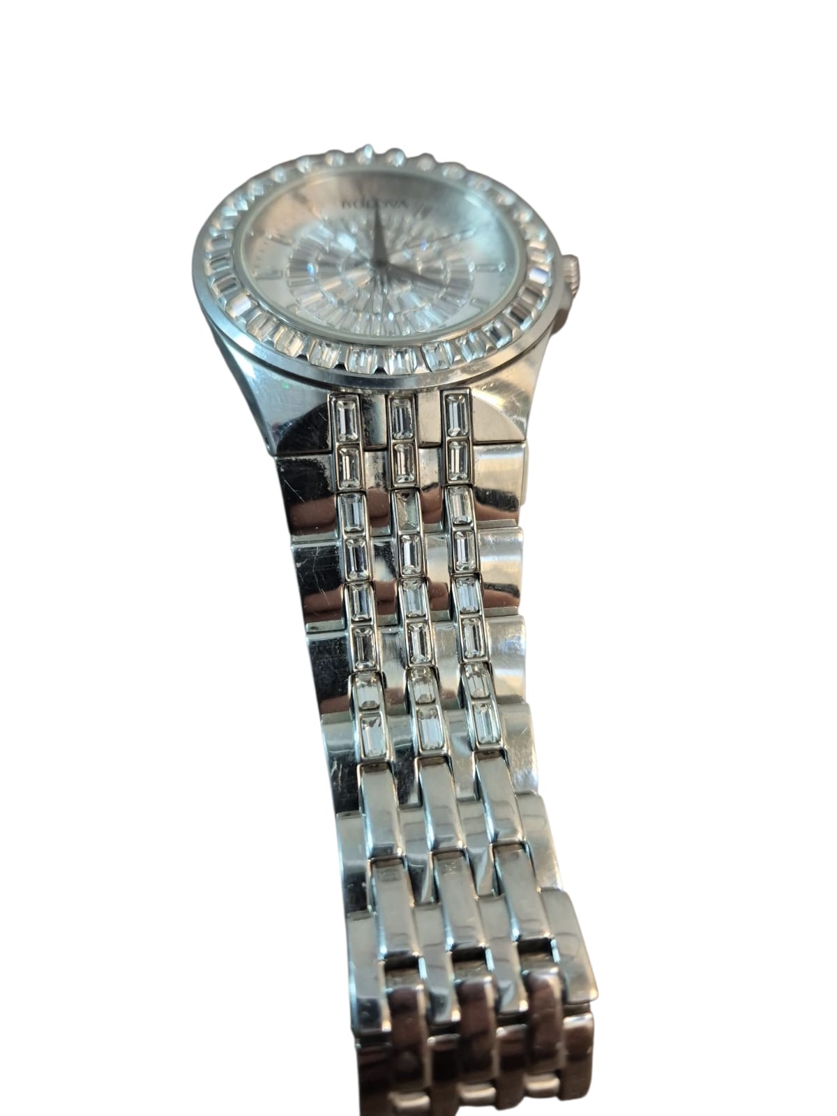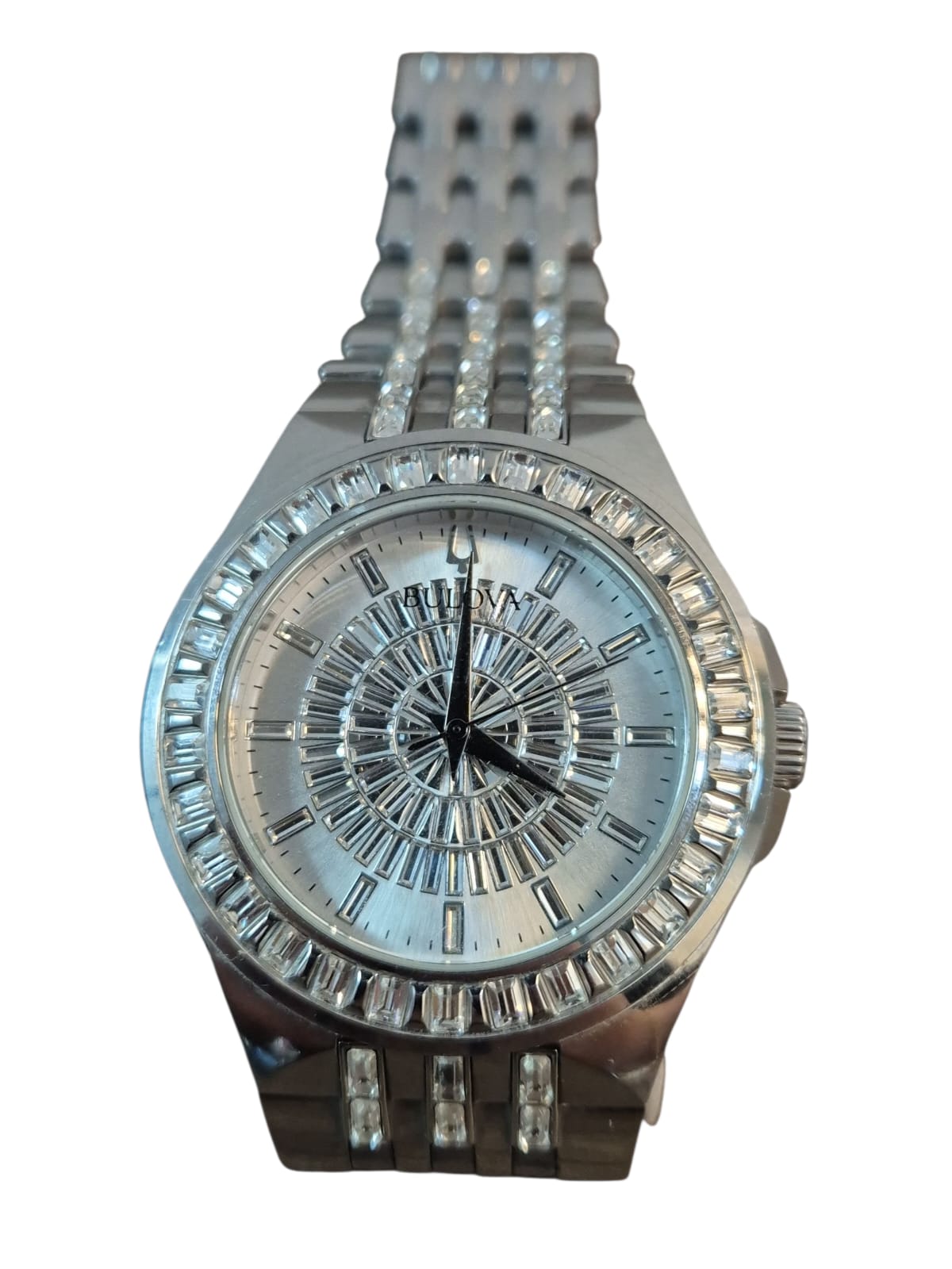 Crafted with a stainless steel case and bracelet and silver-white pave dial this watch is embellished with 156 statement-making baguettes Swarovski Crystals. This timepiece features a deployant closure, flat mineral crystal, and water resistance up to 30 meters.