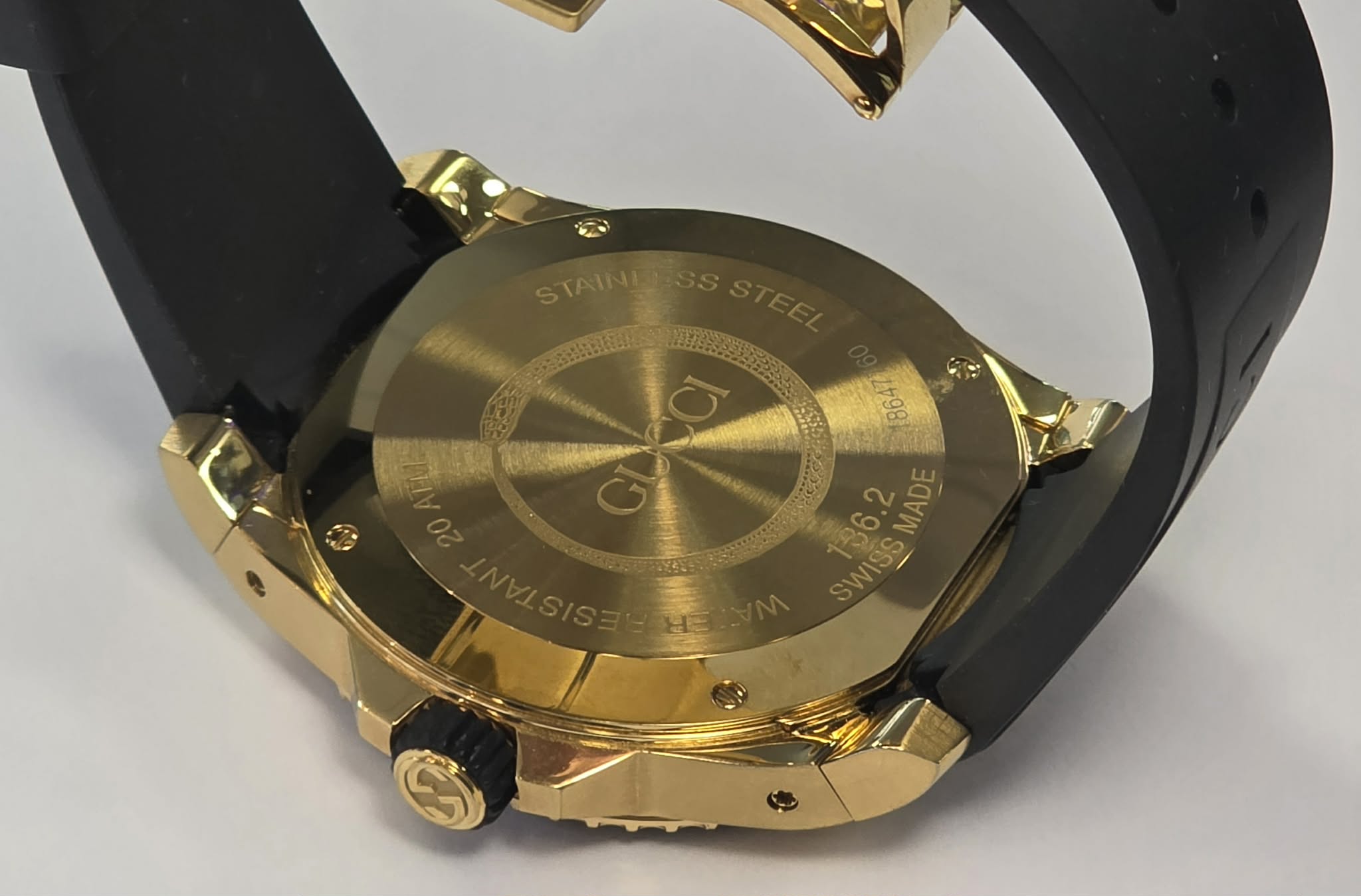 Gucci Dive Quartz Black Dial Black Rubber Strap Watch For Men ***This Gucci watch is in good condition, fully functional, comes with box, no manual included. Silicone thick strap with a unique snake design on the face. ***For any queries please call our Chorley store direct from Mon-Sat on 01257 752333.