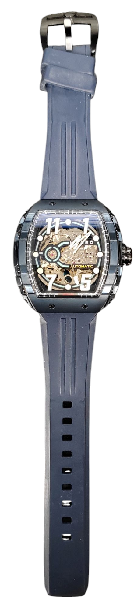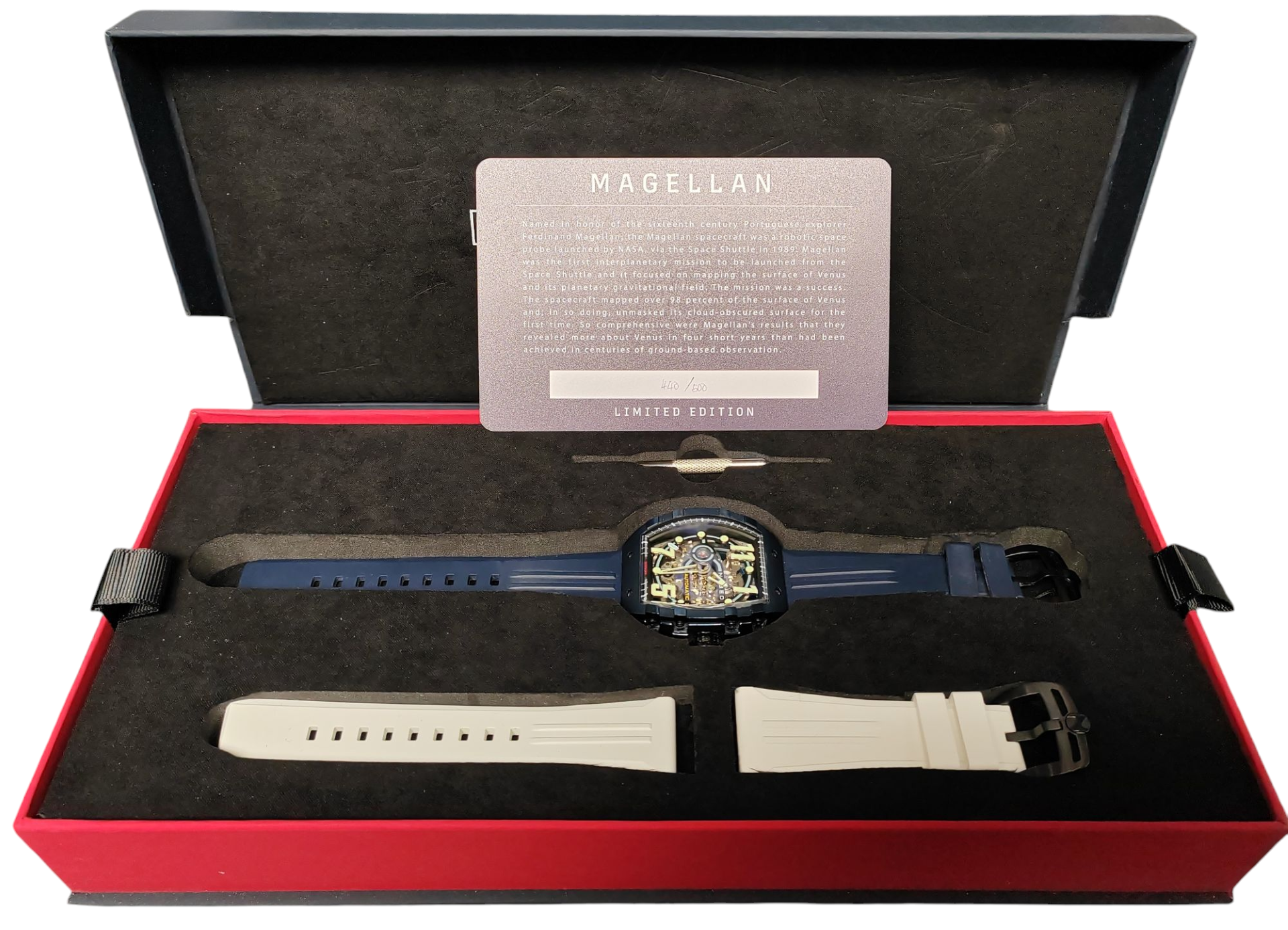 The captivating construction of the Magellan Vision highlights the inner engineering and artistry of the movement framed and housed in a multi-layered dial dressed in luminous materials and oversized hour indexes that create an entirely new aesthetic that is dynamic and captivating. Armed and supplied with a secondary strap for a more compelling and versatile wear. Specifications Movement Automatic Skeleton With 3 Hands Case Material Stainless Steel Case Size (mm) 48.0 Case Thickness (mm) 15.7 Lug to Lug (mm) 51.0 Dial Colour Transparent Index & Luminous Applied Index Lens Anti Reflection Coated Mineral Lens Crown Type Screw Down Band 26mm White Rubber Strap Extra Band Blue Rubber Strap Water Resistance 5 ATM Watch Weight (g) 200