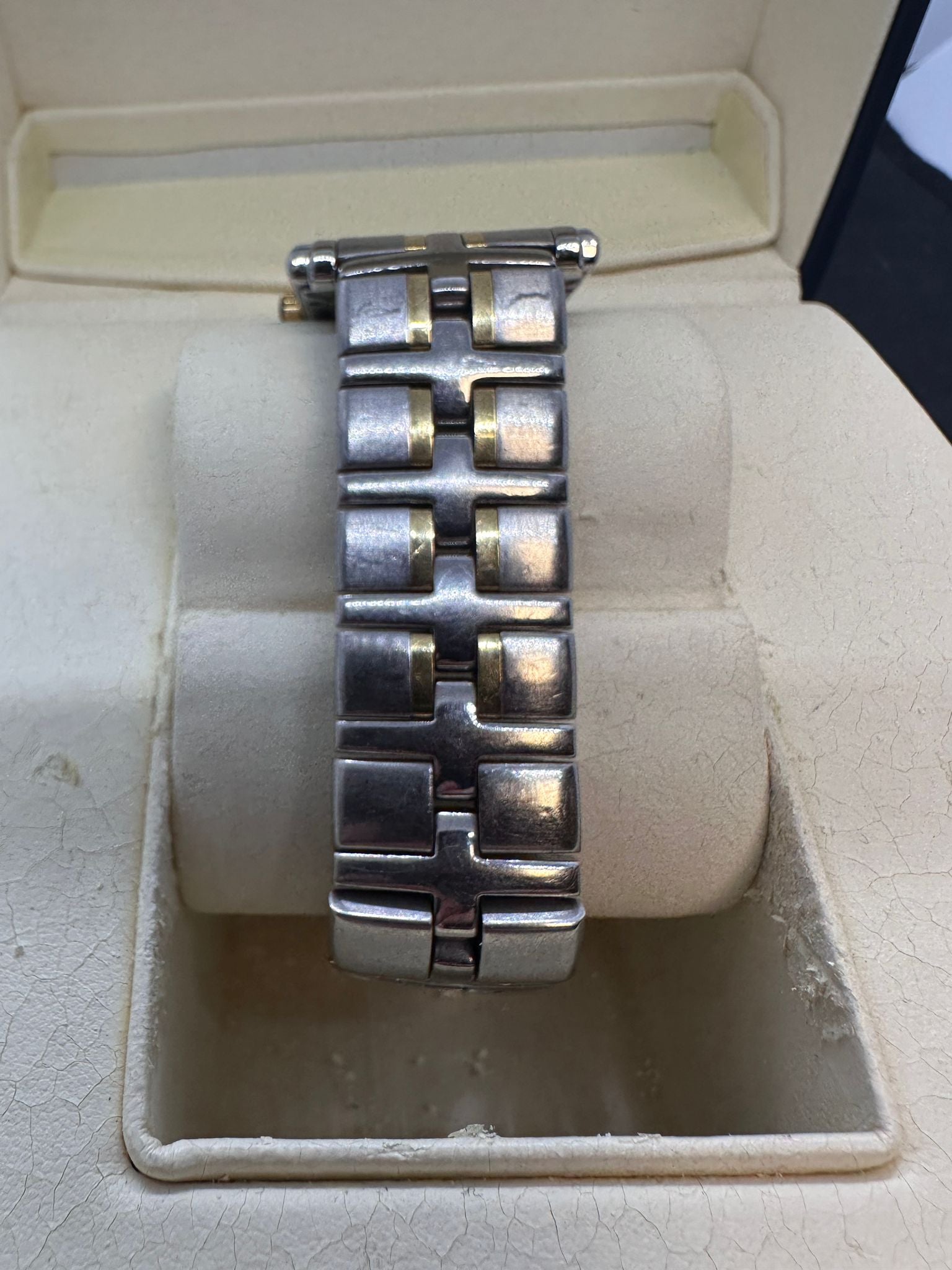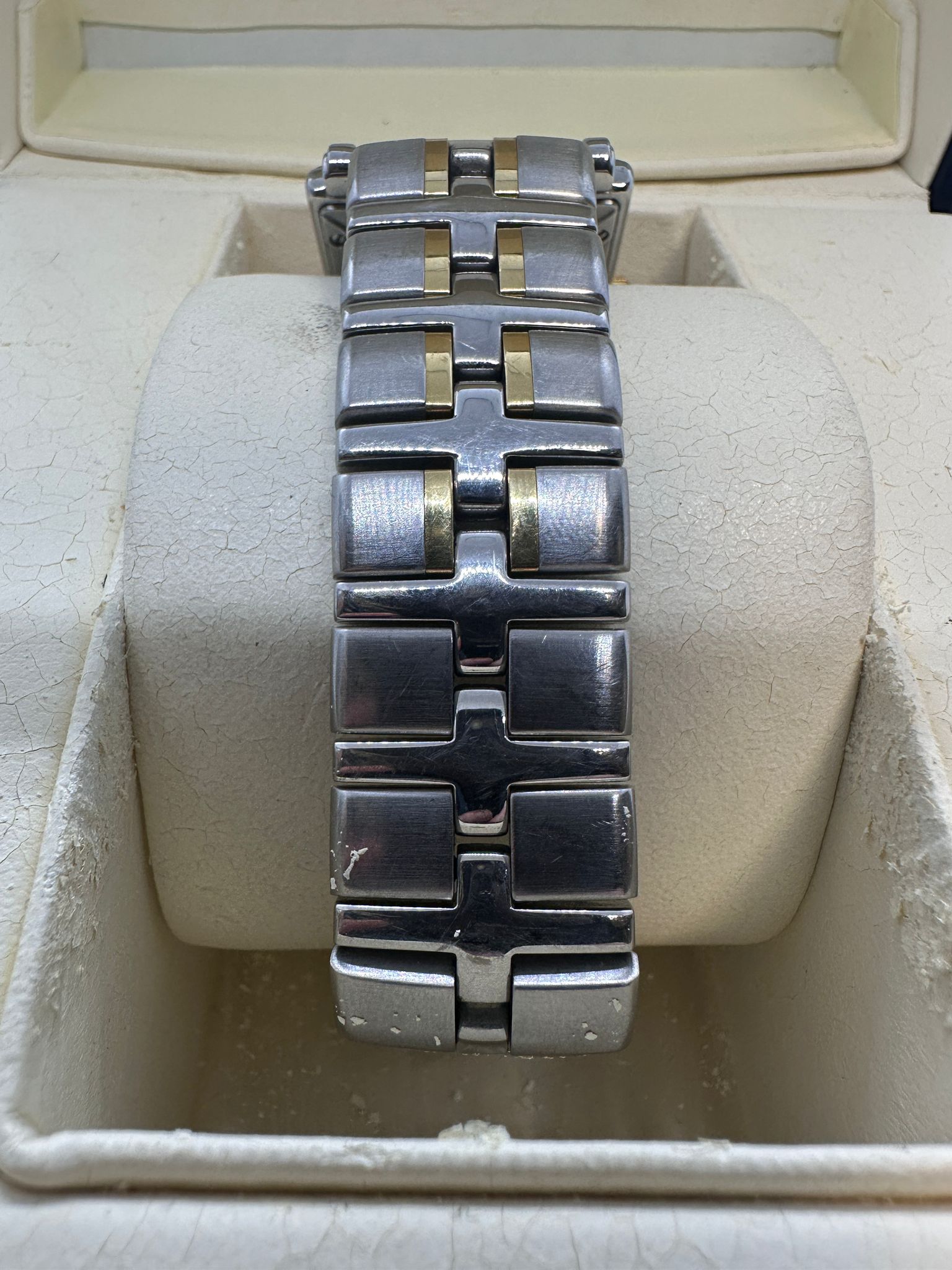 Watch in ok worn condition, there are quite a few scratches to the strap of the watch but nothing that affects the use of the watch. Boxed with paperwork (cert) and 1 extra link.